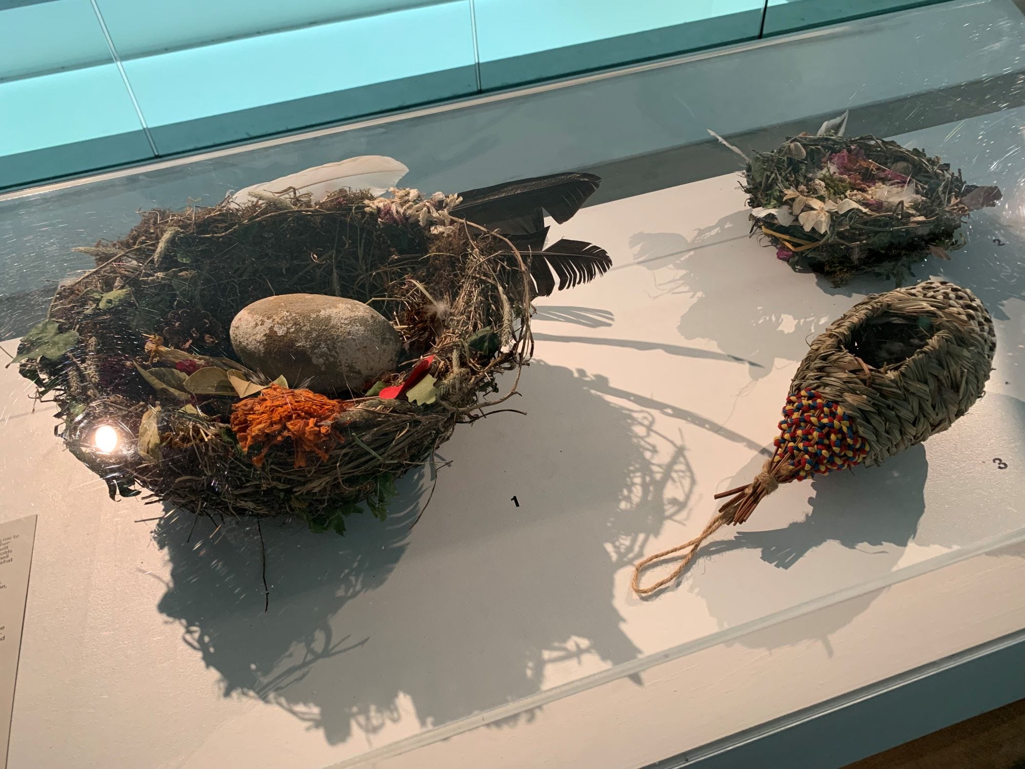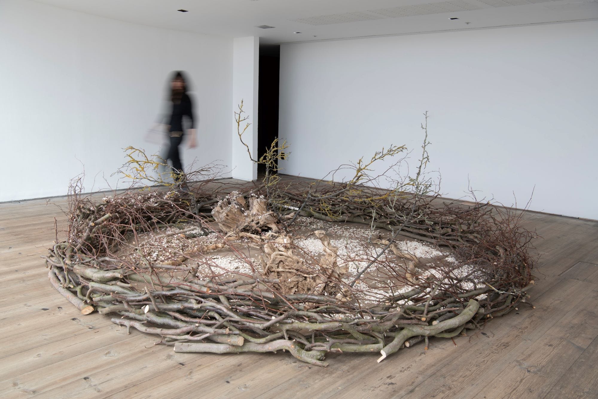 There’s the array of delicate nests, some the work of migratory birds and some of human migrants, and on the floor a ring of roughly woven branches sprinkled with the dried blossoms of the Taihaku cherry tree.