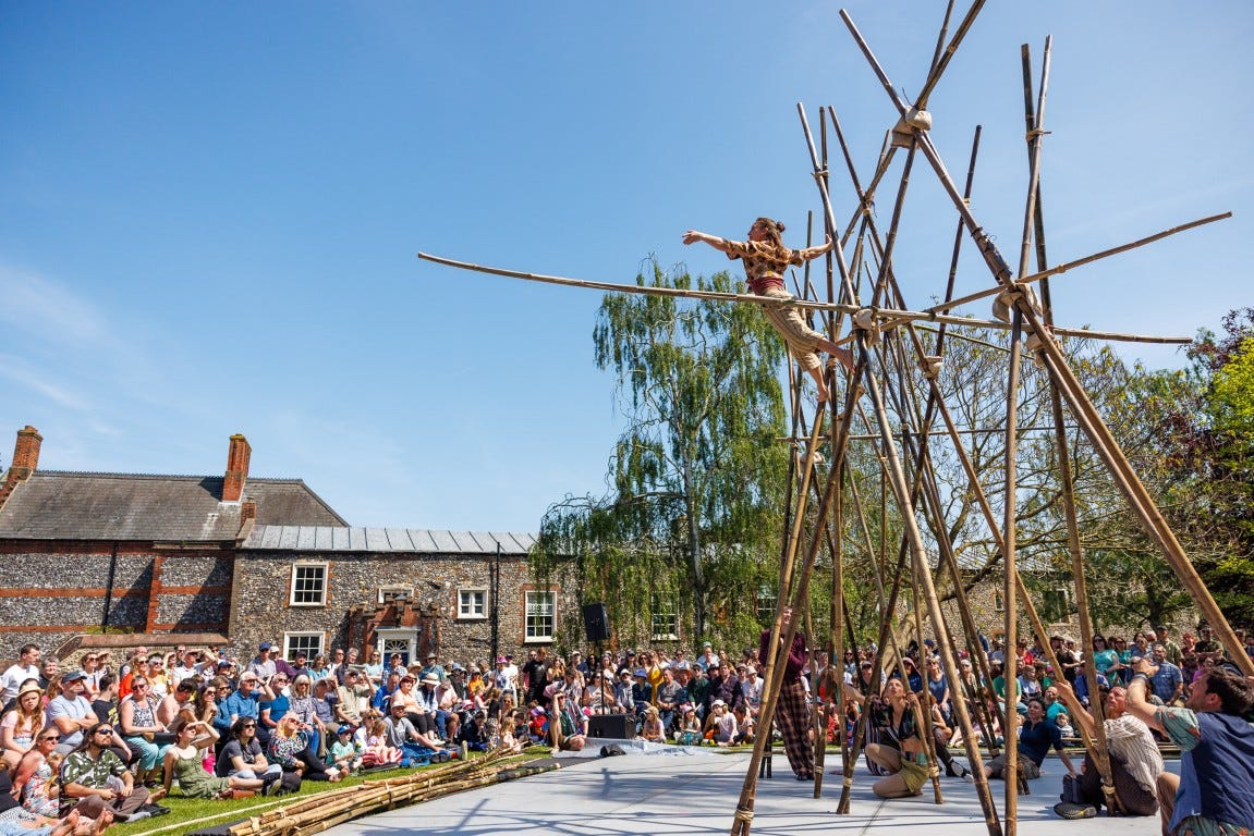 In John Whitehead Park, visitors can explore nature-themed installations and live performances, from circus feats with bamboo scaffolding (BAMBOO by NoFit State), to birdwatching-inspired storytelling (The Hide) and climate-conscious puppetry in Like a Tree.