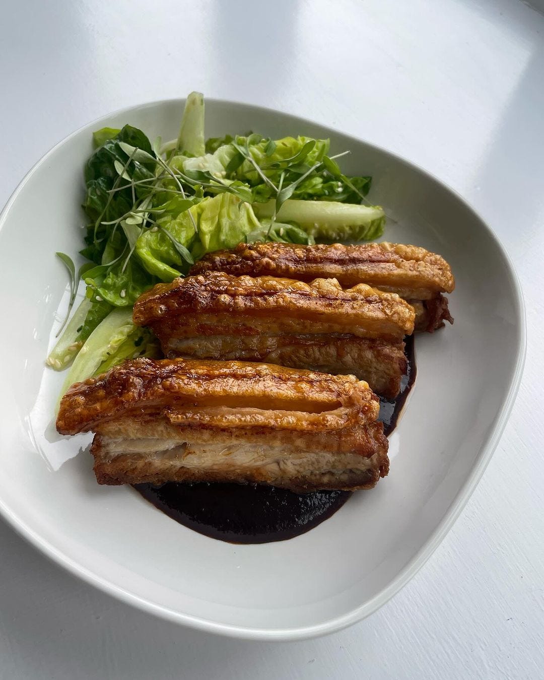 For a main course - spoon sauce onto a plate, slice pork belly and serve on top of sauce with your choice of greens. For a snack/appetiser - cut the pork belly into bitesize chunks, toss in the sauce, serve on small bamboo skewers.