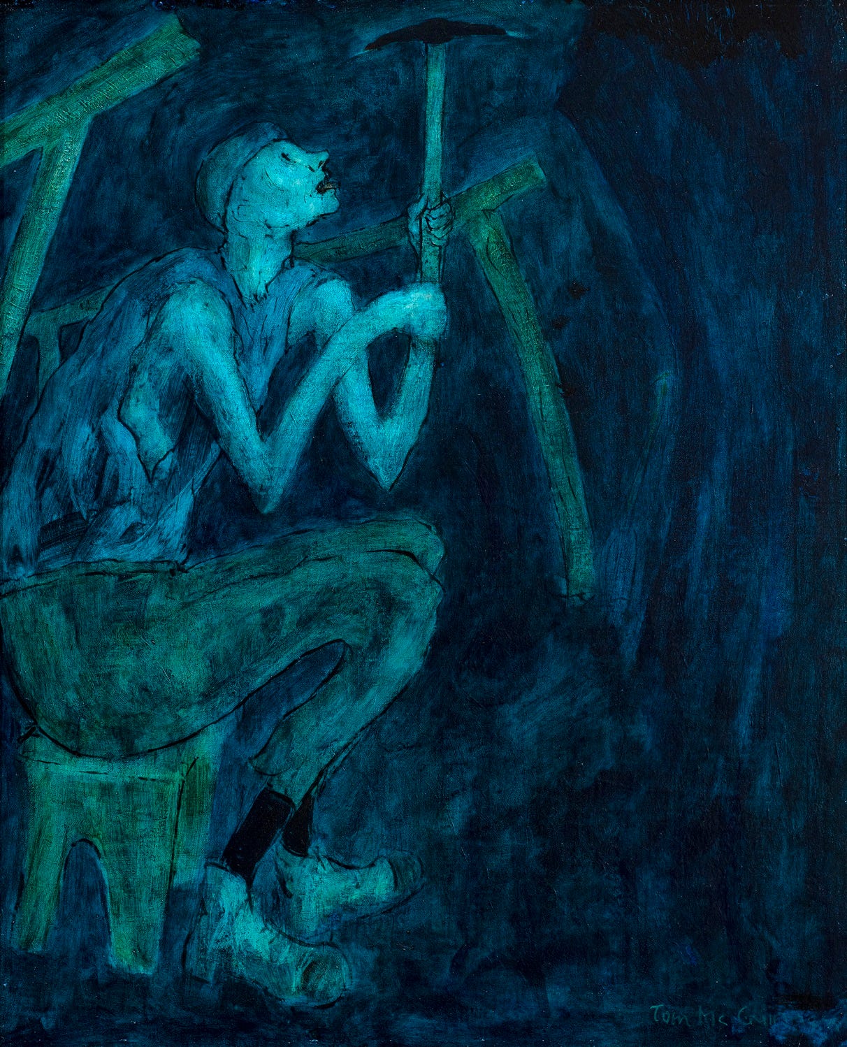 Born in Witton Park and sent underground as a Bevin Boy in 1944, McGuinness spent 39 years in the mines, painting daily what once seemed an indestructible industry. His bowed figures, shaped by tunnels and lit by distinctive green and blue glazes, capture not just the labour of coal mining but its emotional weight.