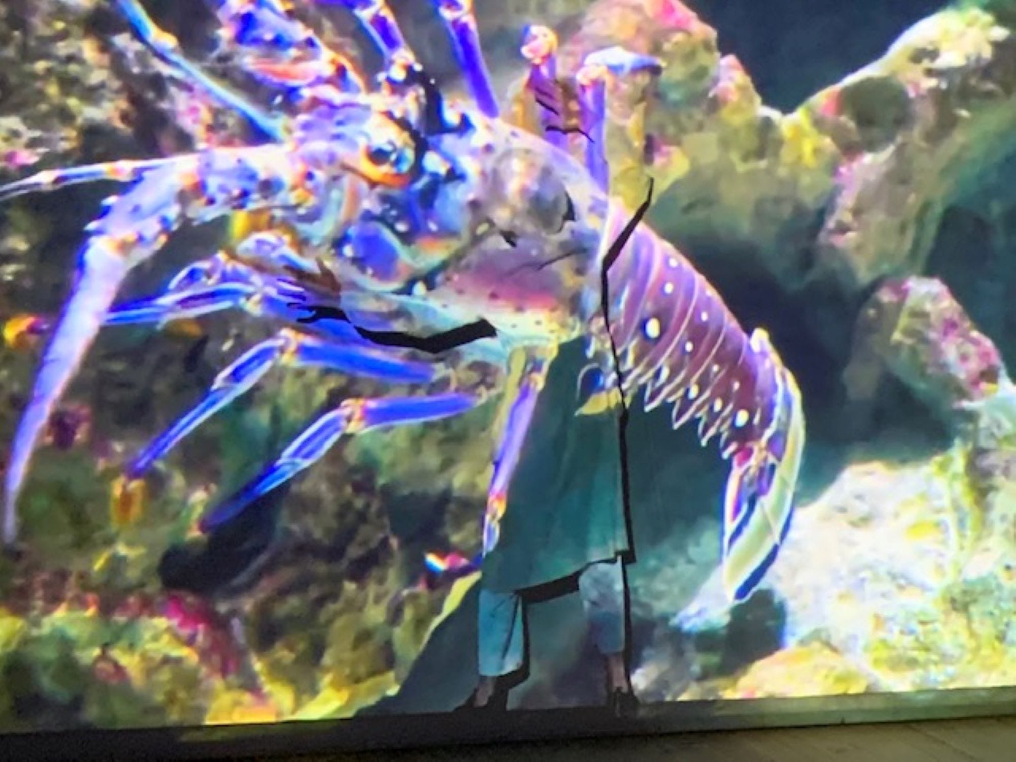 A film by American video and performance artist Joan Jonas appears to show her fraternising with a giant crustacean.
