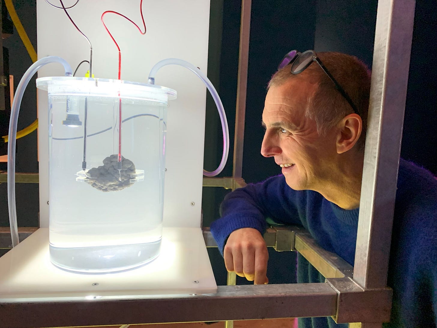 In a jar of sea water, precisely matching the saltiness of the deep ocean, resides a nodule attached to platinum electrodes which monitor the oxygen-producing electrical current it emits.