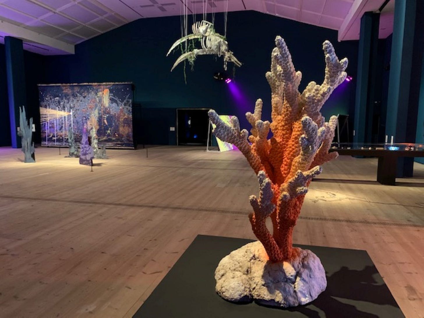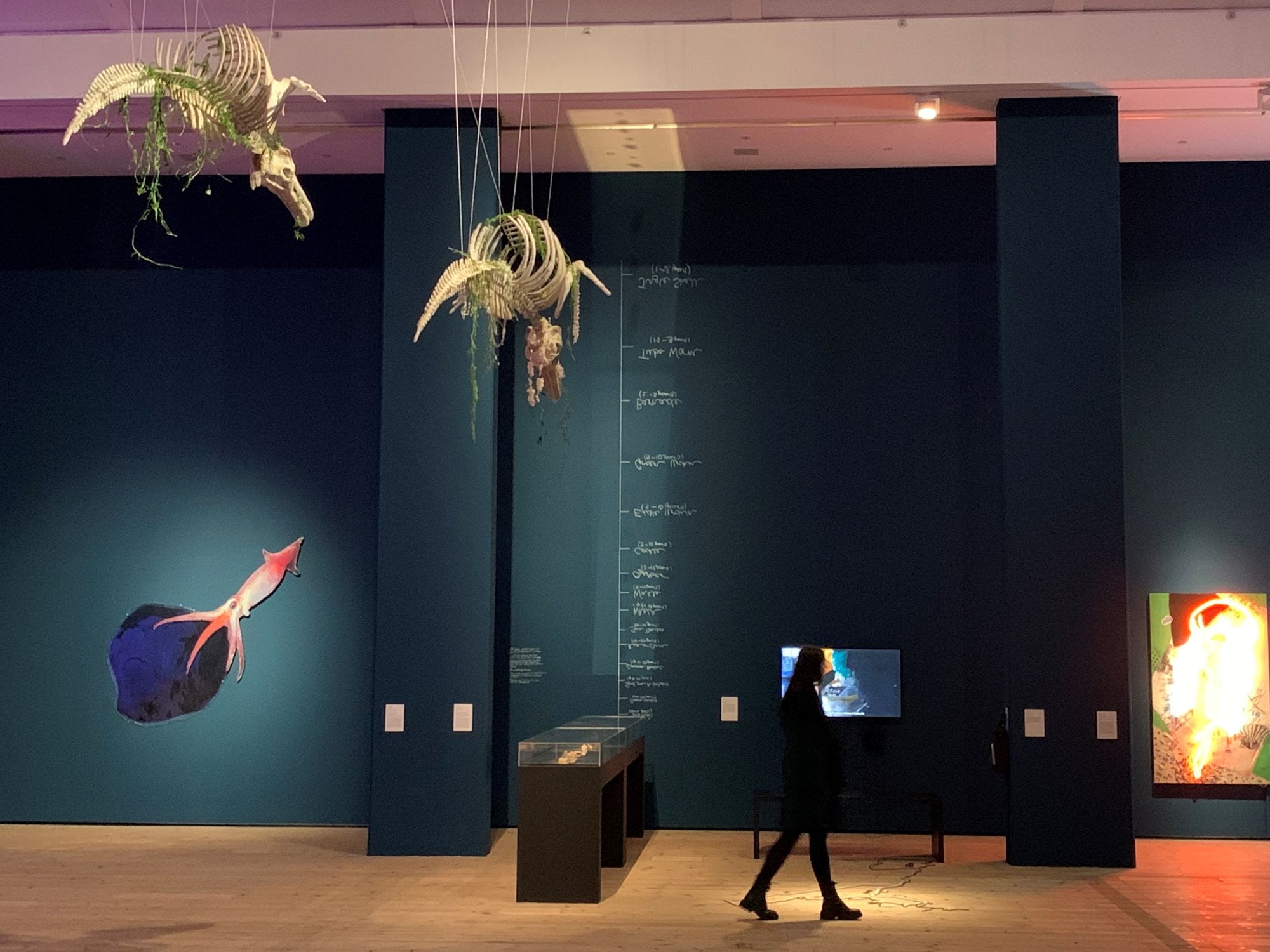 Londoner Shezad Dawood’s coral reef sculptures rest on the floor beneath dangling model skeletons of threatened dolphin species by Bianca Bondi, from South Africa.