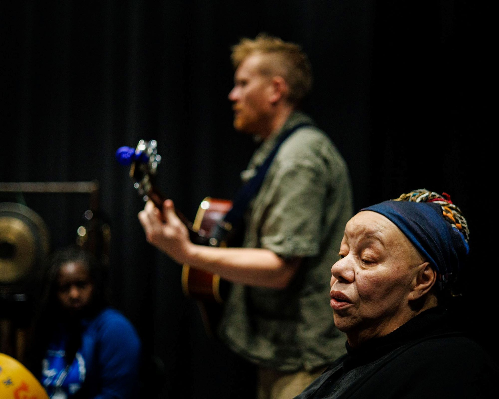 At the back a musical trio waited patiently. Hannabiell Sanders, best known for her trombone, sat behind a steel pan; ace percussionist Brendan Murphy was on guitar; singer Andrea Jones was seated magisterially between.