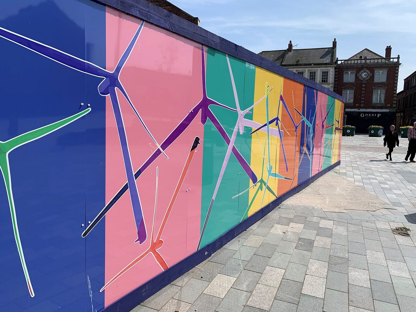 Hoardings opposite Market Pavillion showcase the work of Blyth artist Dex Hannon whose vivid Windtwisters artwork references the wind turbine, “a totem of Blyth’s evolving identity”.
