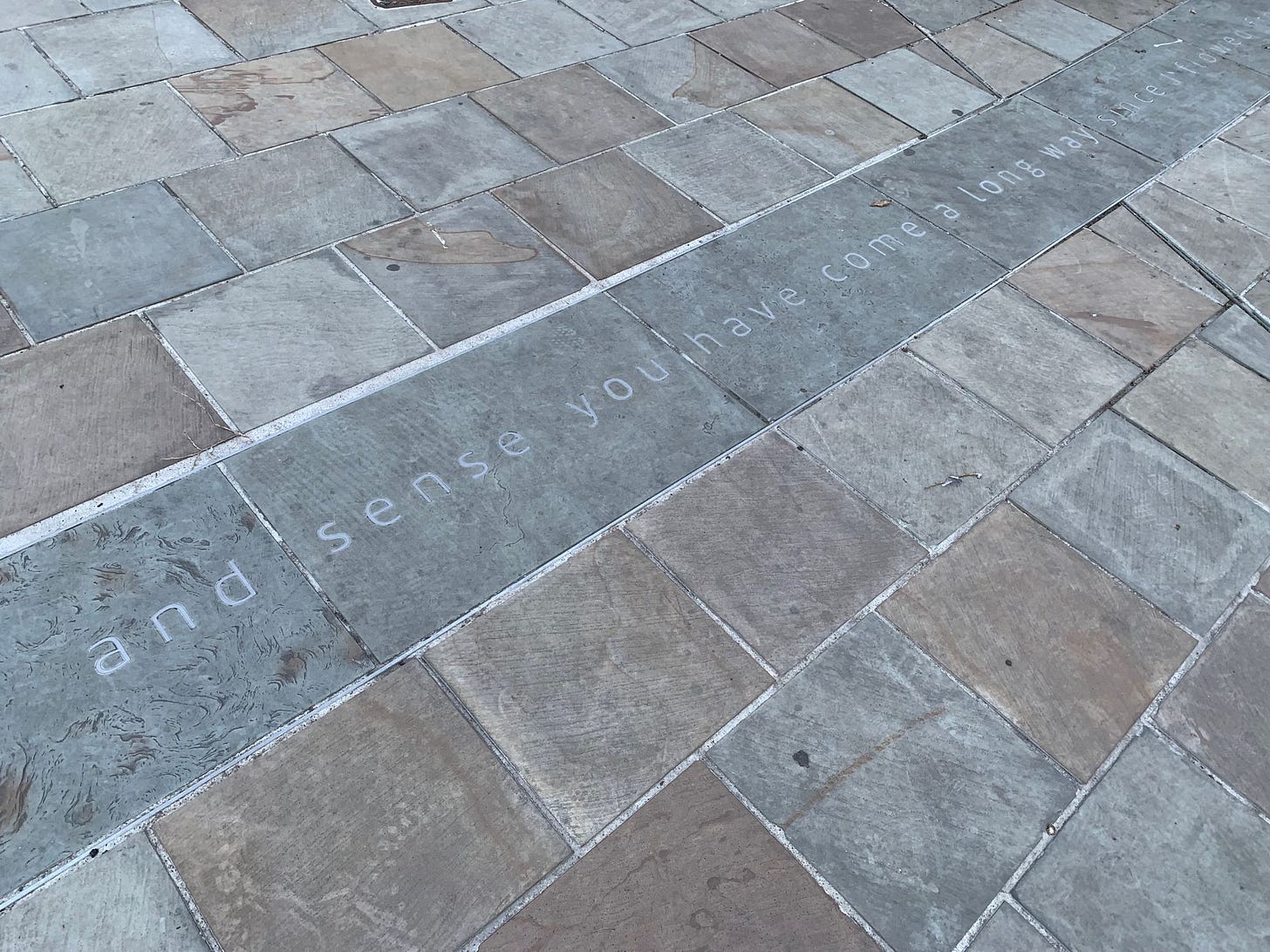 Engraved in the pavement outside the library, and tracing the line of an underground waterway known as The Gut, are two lines of poetry by John Challis, from North Shields.