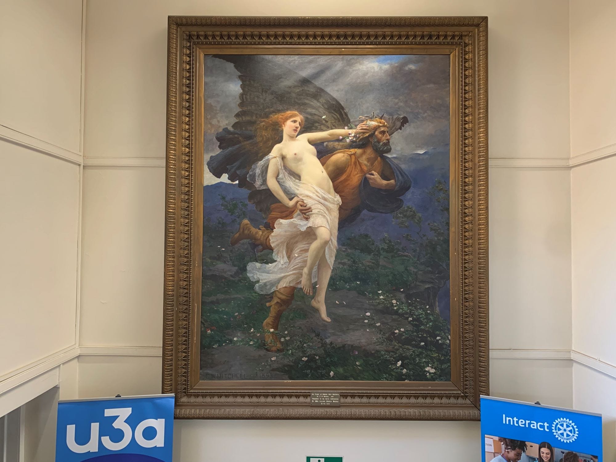 The canvas in its monster frame is called The Flight of Boreas with Oreithyia and it is signed CW Mitchell and dated 1893.