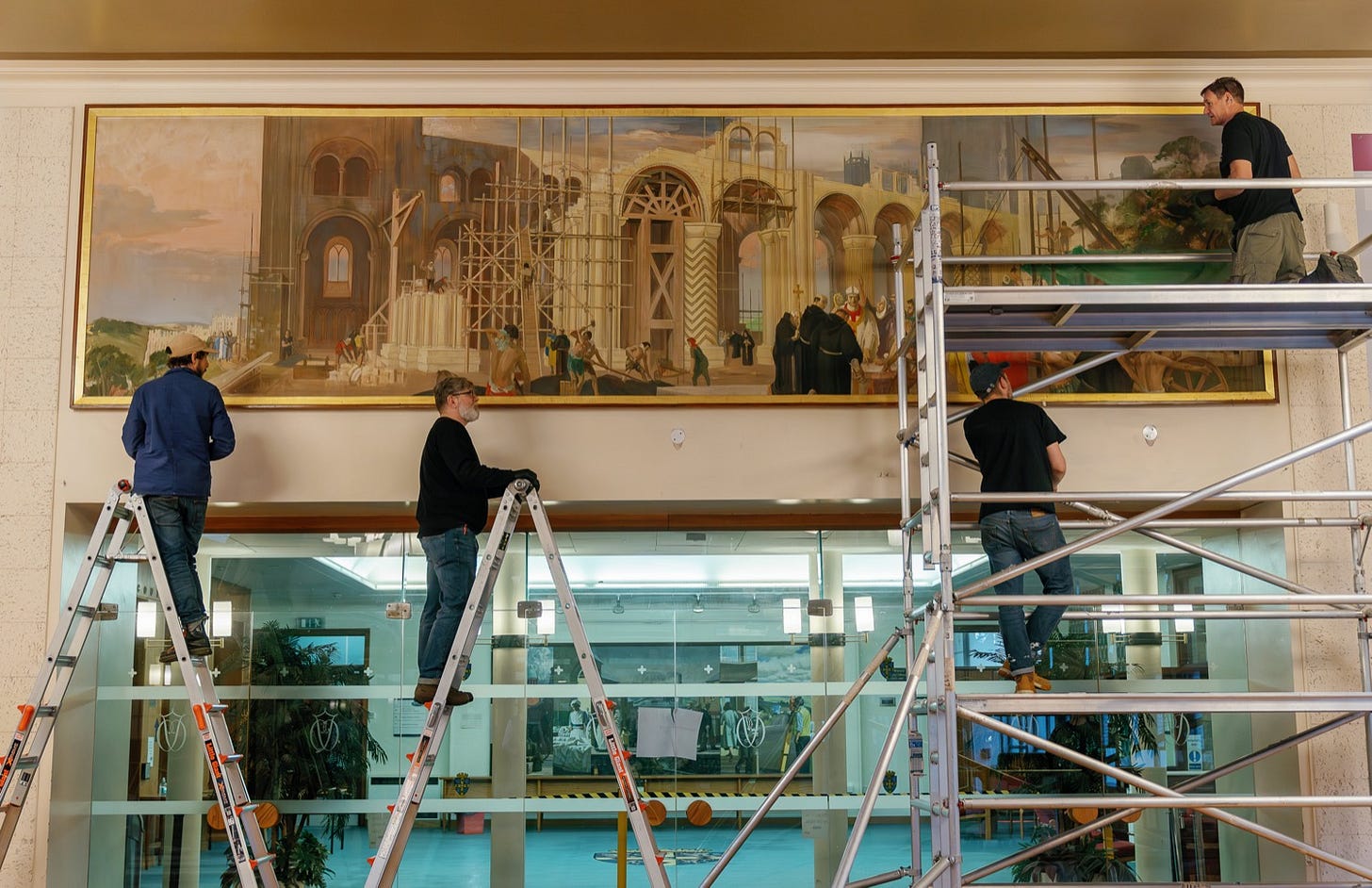 The hall is due to be demolished and now the seven-metre-wide painting depicting the construction of the cathedral has found a new home at the Main House of Ushaw Historic House, Chapel & Gardens.