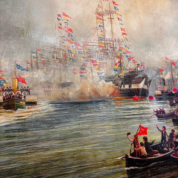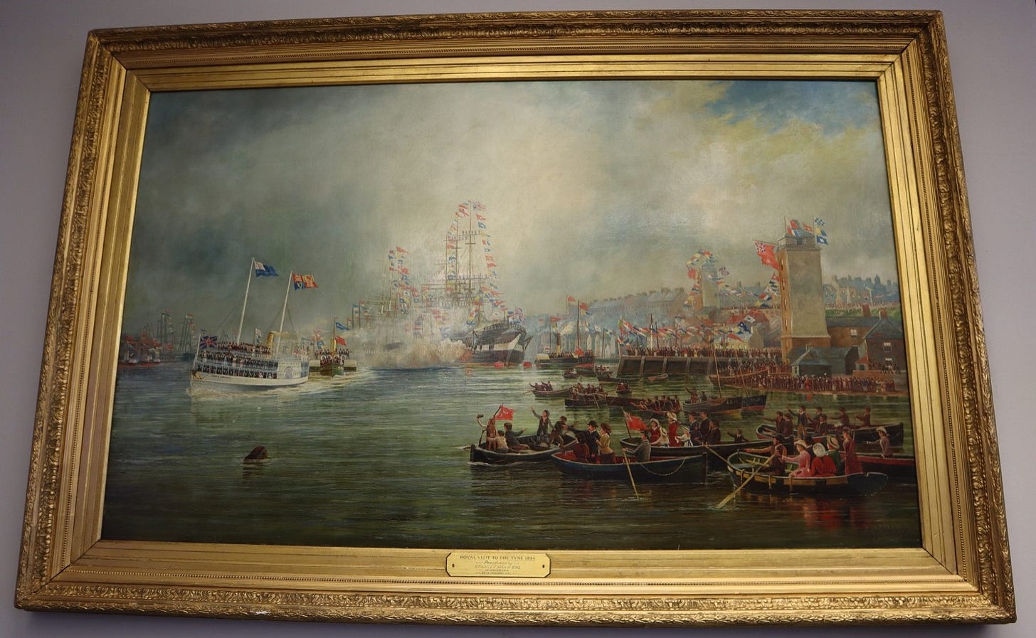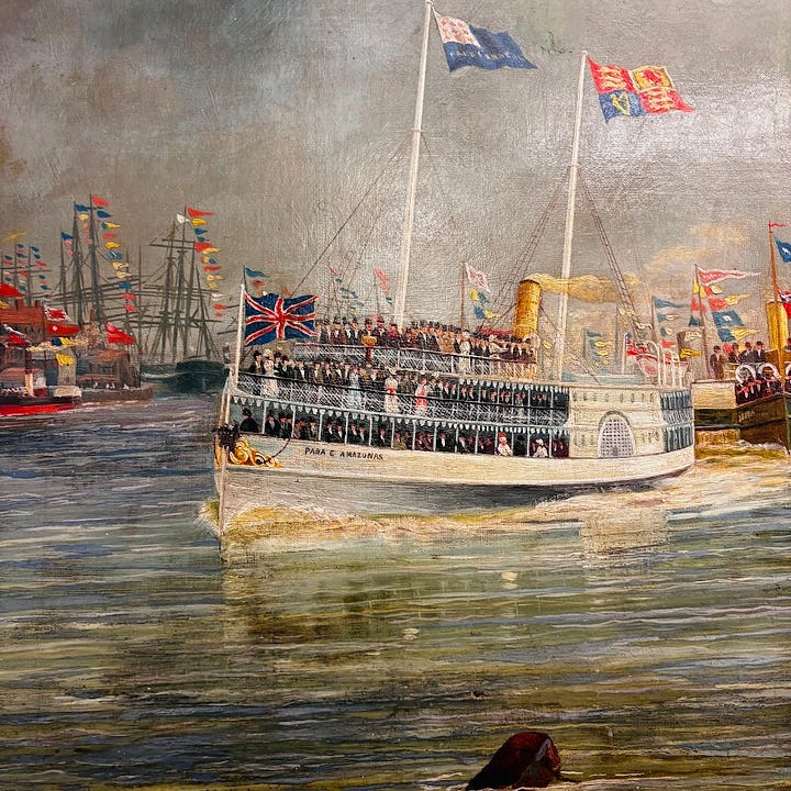 Liddell’s work captures the moment the Royal party, travelling on the steamer Para-e-Amazonas with their sons, reached North Shields as crowds lined the riverbank.