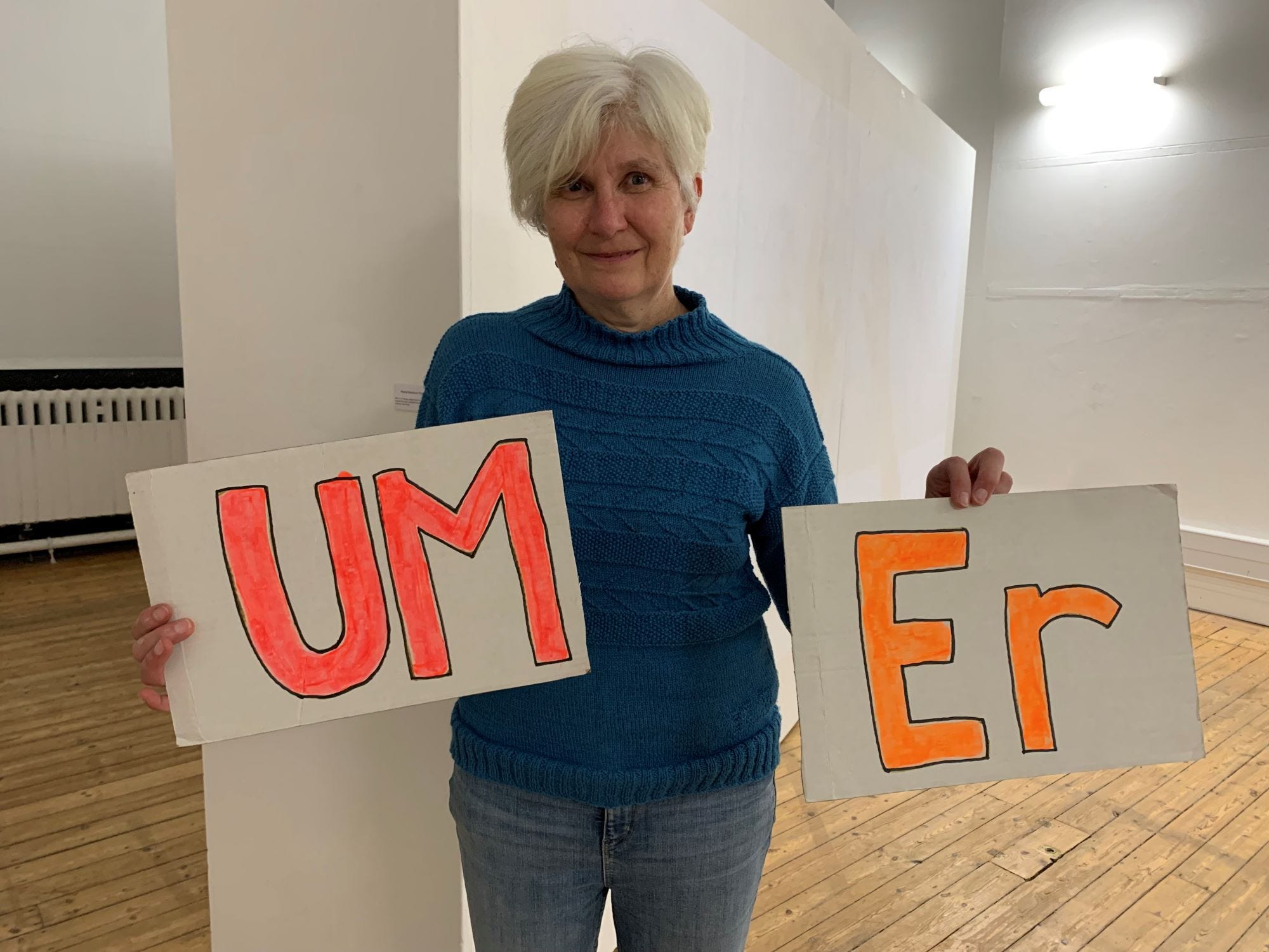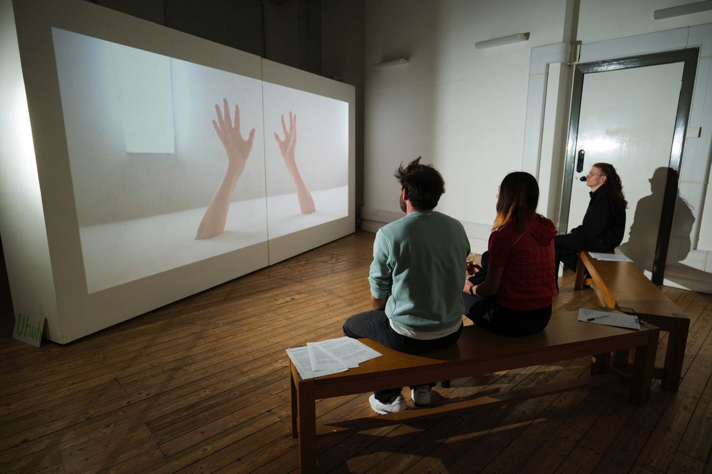 The exhibition comprises a handful of video works, the biggest of which does indeed focus on hands, and some text-based paintings featuring expressions of hesitancy, including ‘Um’. ‘Er’ and ‘Uhuh’.