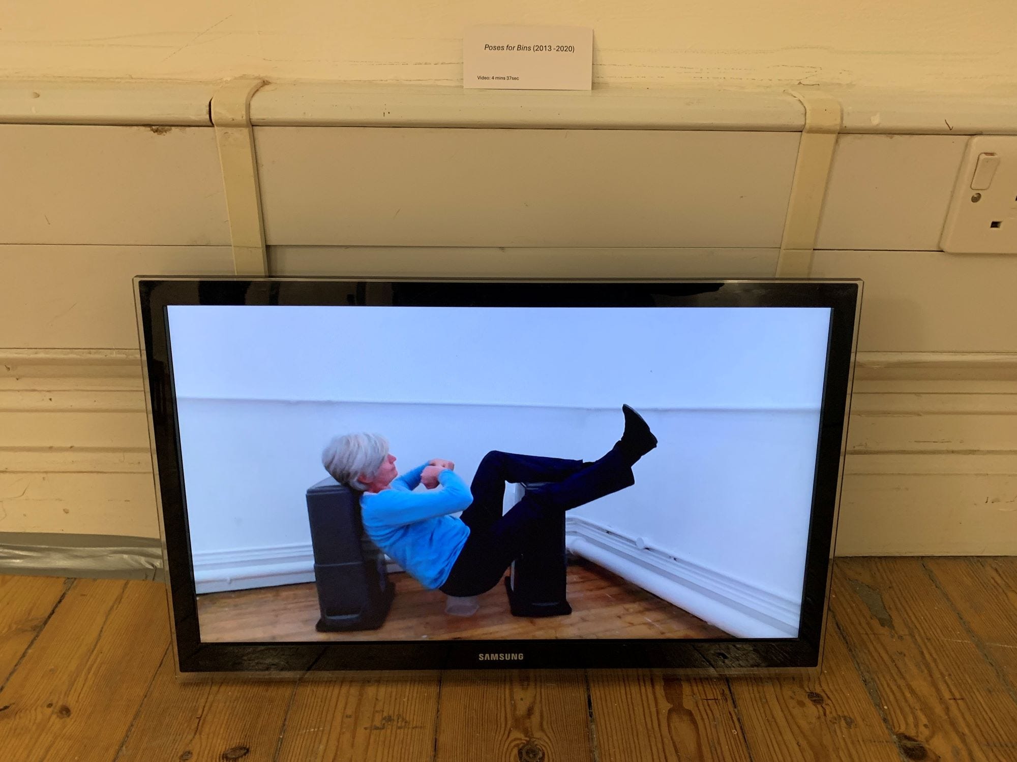 Among the other videos on display is Poses for Bins, Kate’s homage to a 1971 work by the artist Bruce McLean called Poses for Plinths. He had himself photographed posing awkwardly on parts of sculptural plinths; she did the same on bins.