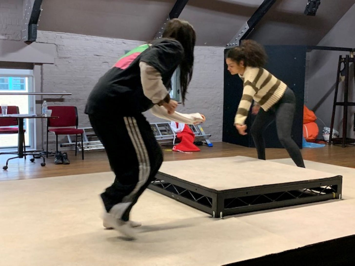 I can vouch for the fun side of the show, having just watched the two actors energetically rehearsing a scene with Jack and movement specialist Alicia Meehan (with props by Amy Watts).
