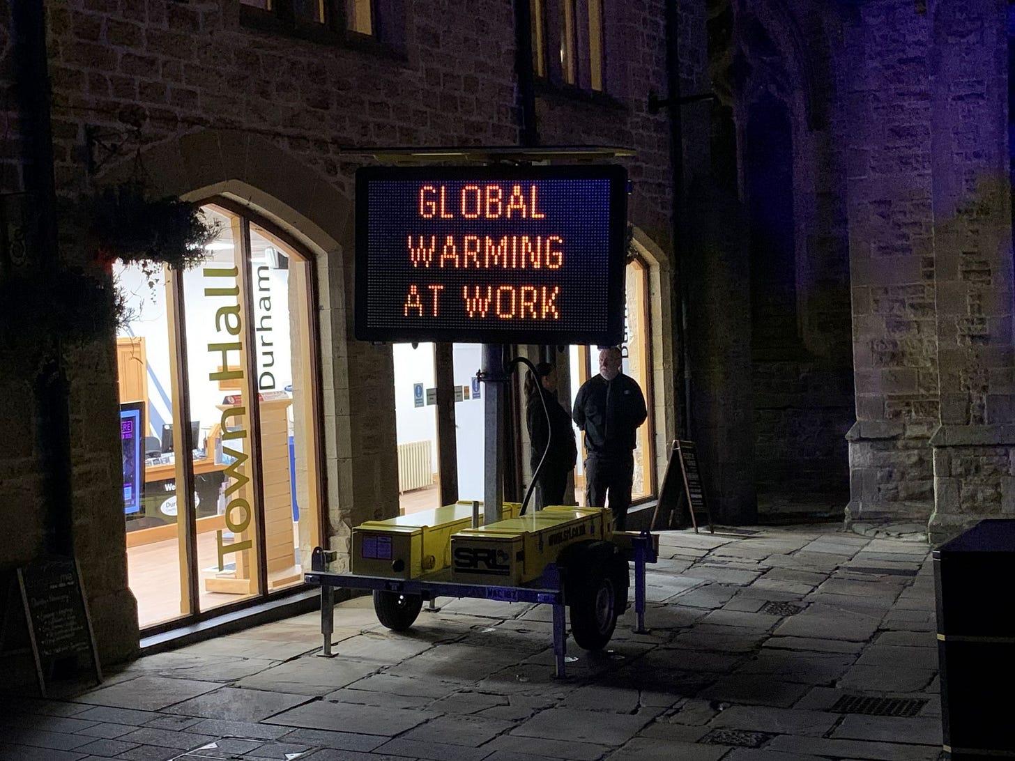 In a corner beside the entrance to Durham Town Hall, a little screen on wheels was flashing messages designed to get under our skin.