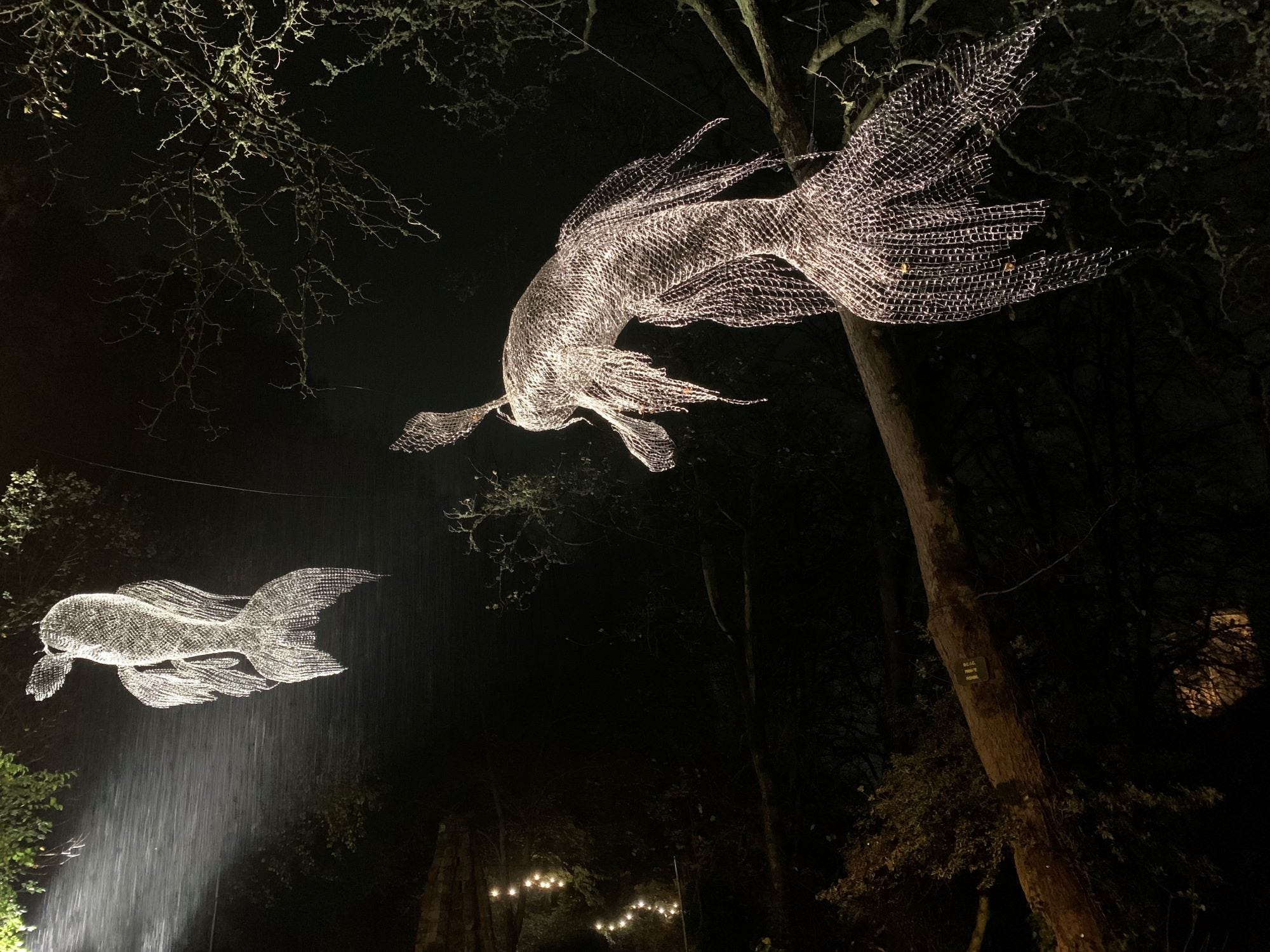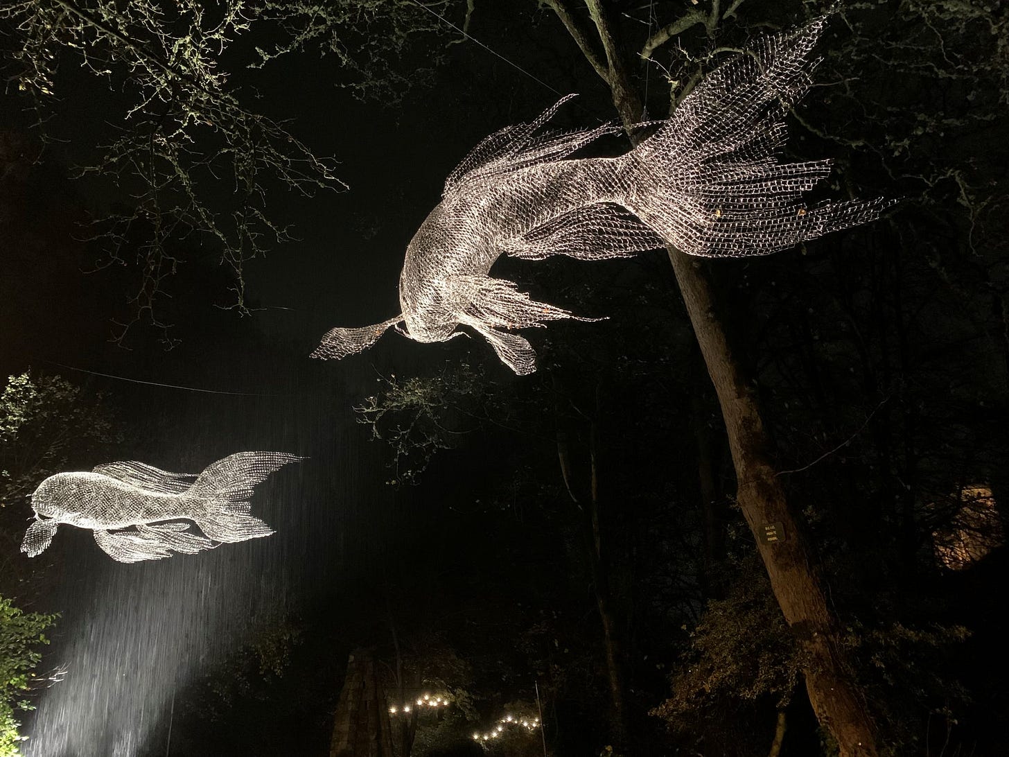 Outside in the rain, falling more heavily now, we strained our eyes at Jony Easterby’s The Garden of Shadows where lights amid the trees settle every now and again into the loose outlines of figures.
