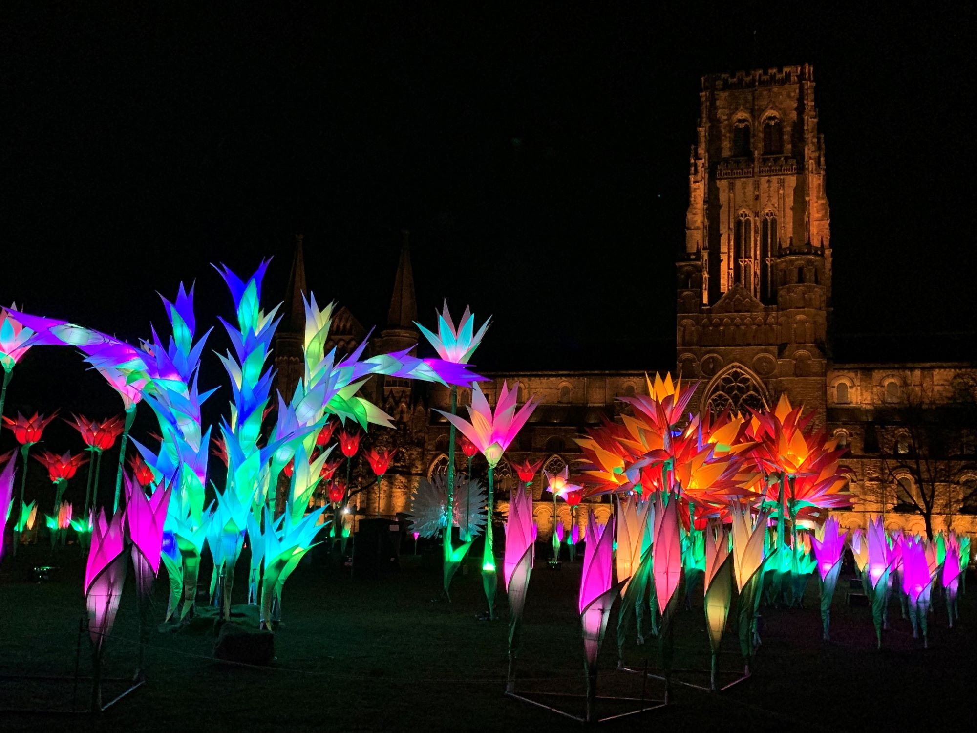 There were colourful light boxes showing various grasses arranged in front of St Mary’s Church and further down South Bailey fireflies seemed to be doing a manic dance among the trees.