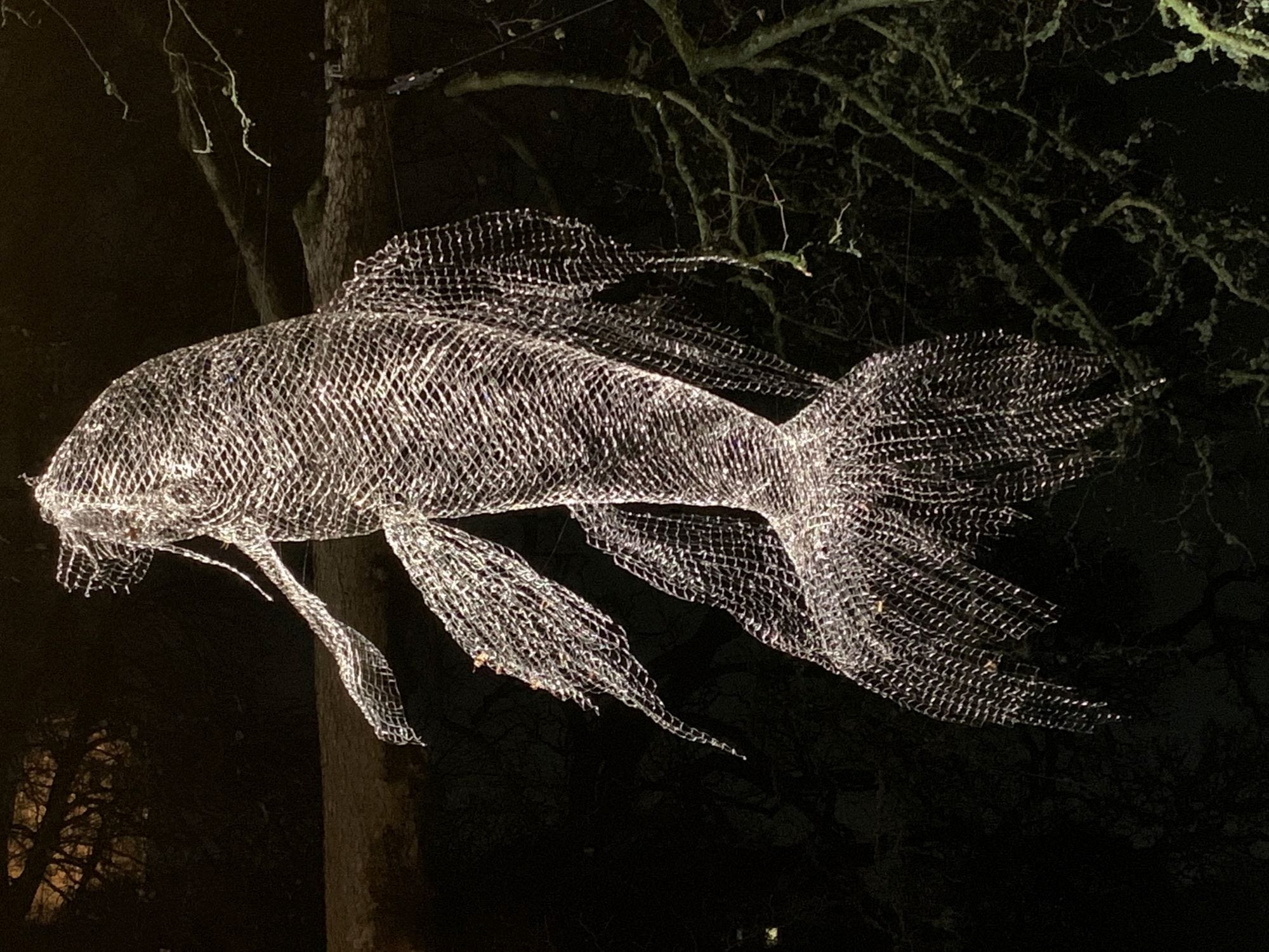 Finally, across Prebends Bridge to see French artist Cédric Le Borgne’s The River – except it’s not a river but a trio of giant koi carp swimming gracefully among the trees, and now shimmering in the rain.