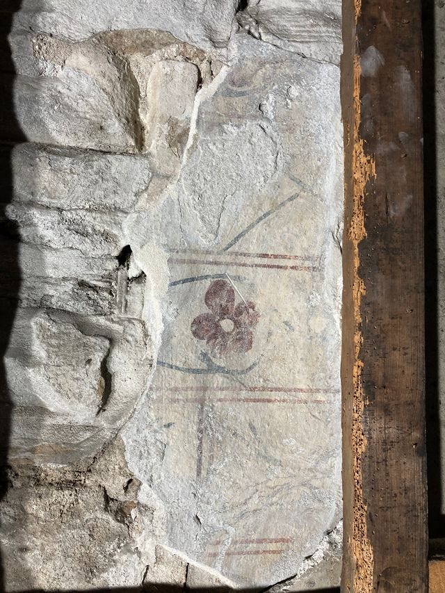Covered by later plasterwork and then 1950s wall panelling, the painting is made up of an outlined masonry pattern with a central flower and stem motif.
