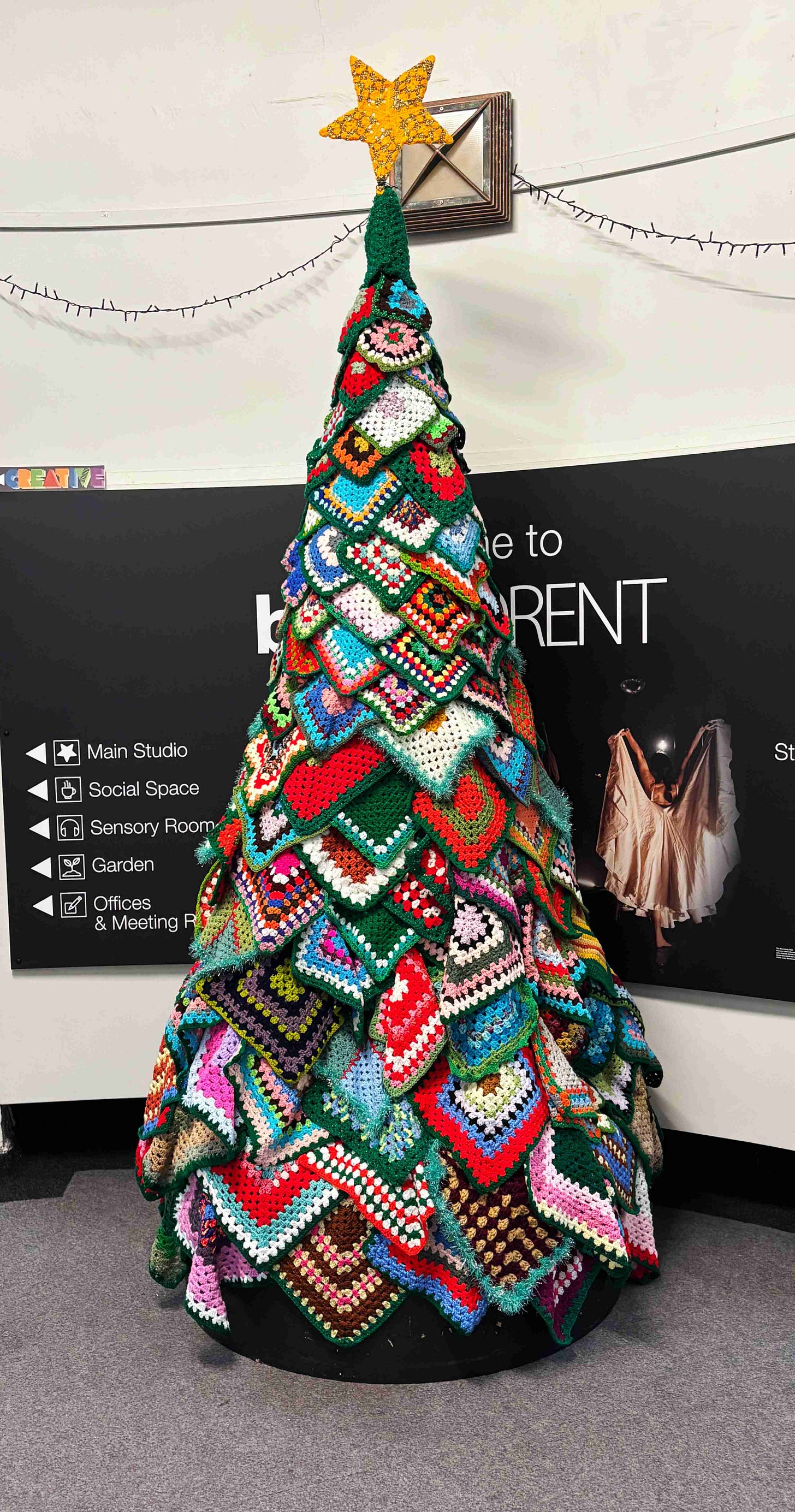 Topped with a golden crocheted star, the tree now stands in the foyer of balletLORENT’s Scotswood studio. No new wool was bought for the project, with the group instead making use of leftover yarn donated or gathered over time.