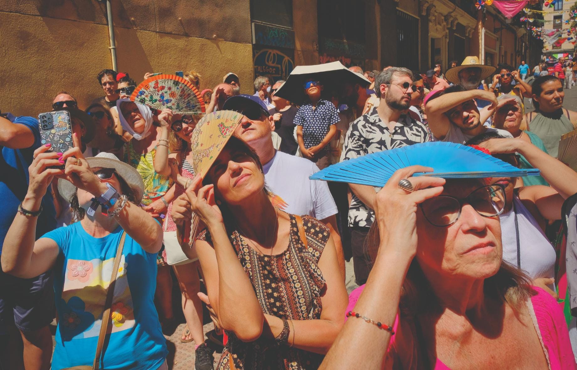 In this image, spectators were watching a screen outside the Church of La Paloma, inside of which a firefighter was climbing up to bring down an enormous framed portrait of the Virgen, which later was placed on a decorated platform and carried on men’s shoulders on the parade.