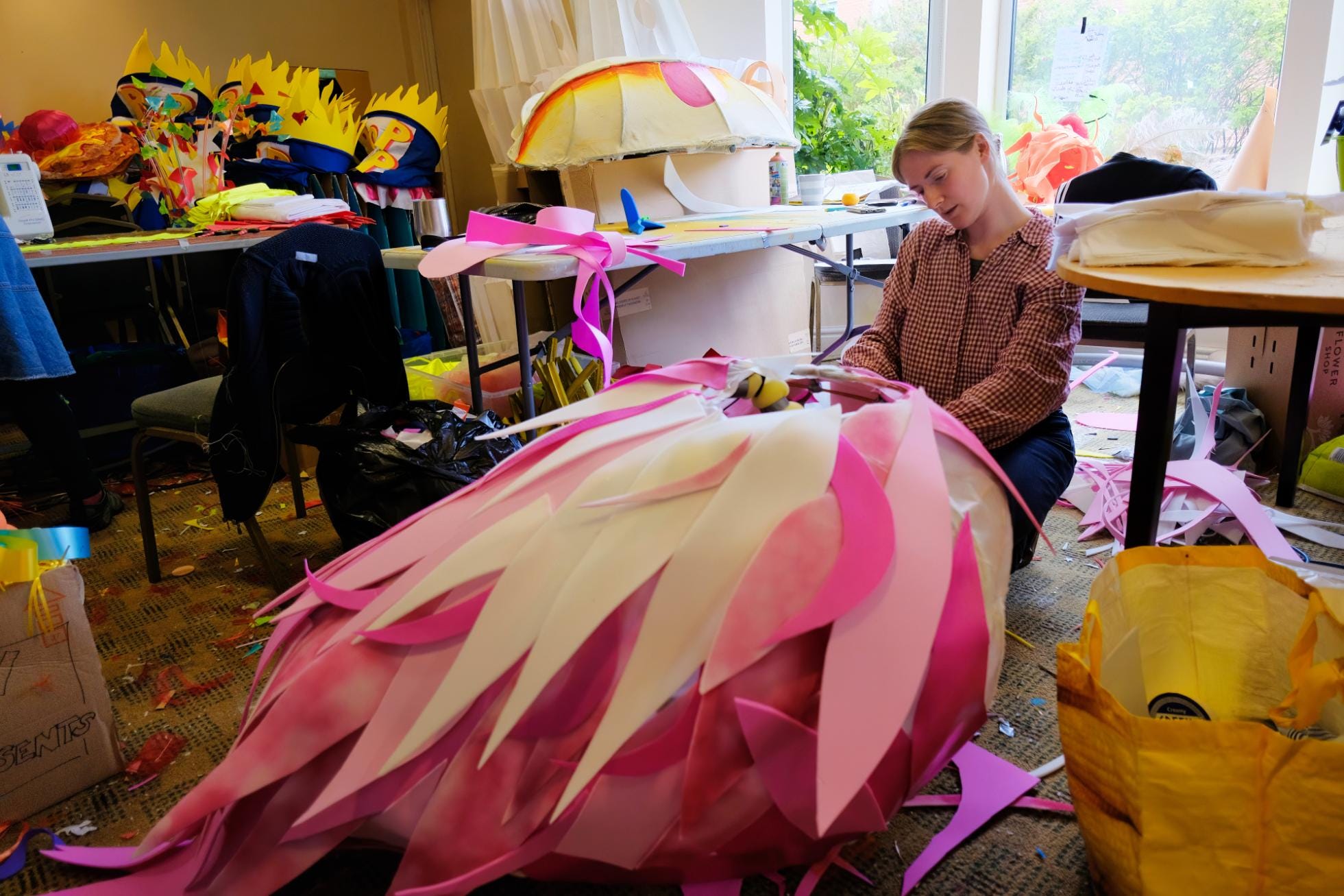 This photo shows Rosie lovingly and painstakingly making a flamingo costume that she wore to the parade in spectacular fashion.