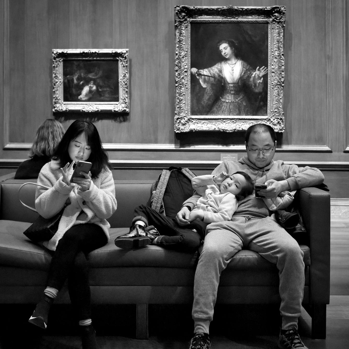 I find museums can also be very welcoming, relaxed spaces, and many people take the opportunity to sit down and rest for a while. I noticed how this family was a bit — ironically — disconnected during their break, as the adults are looking at their phones, while the little girl is probably asking ‘What’s the point? (I want to go!)’.