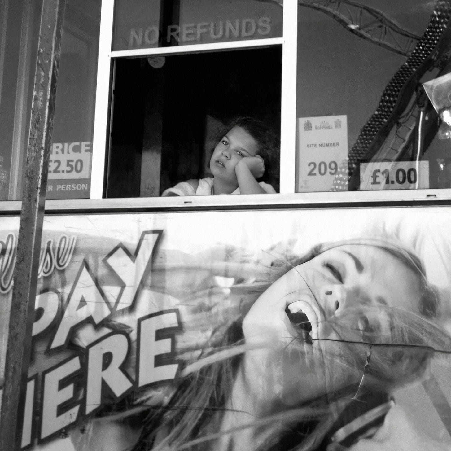 Rather than photograph the rides, I like to look for quieter moments, like this, with the girl in the booth daydreaming, her gesture echoing the picture below her.