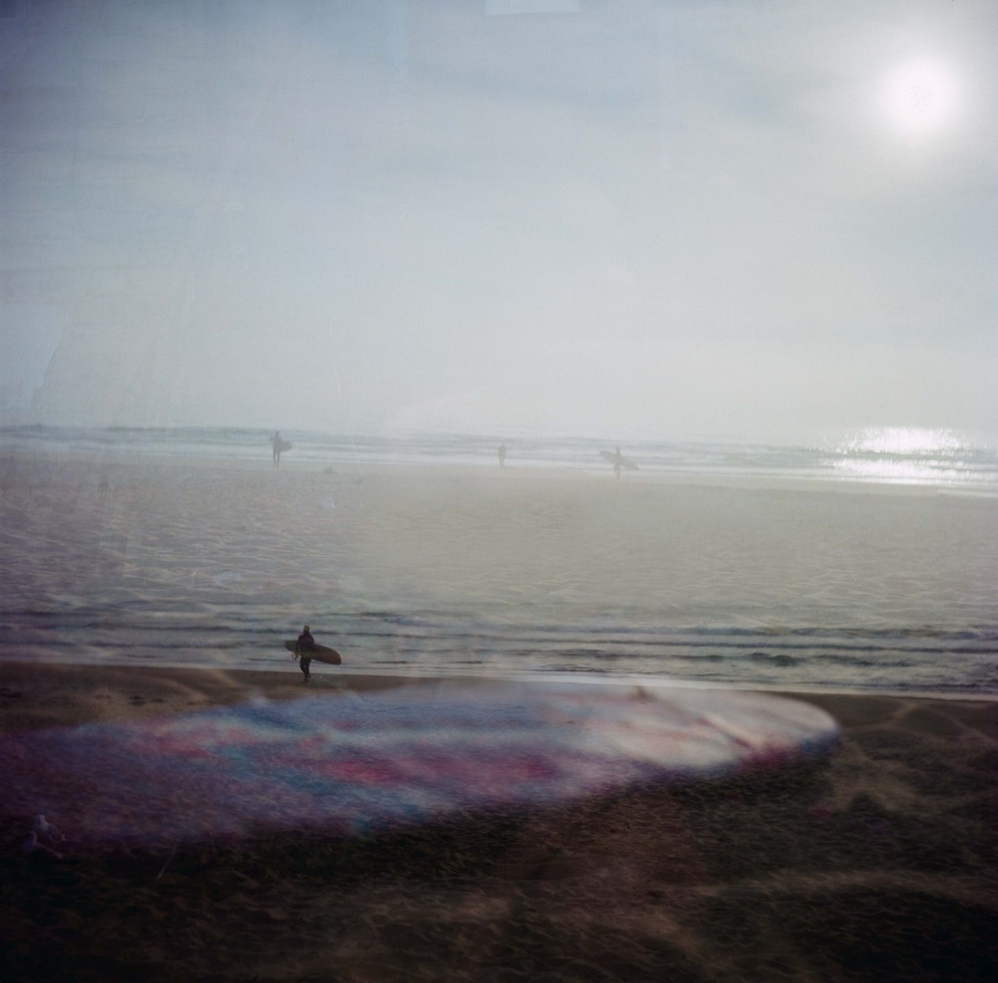 Again I have used the technique of multi exposures. If you look closely enough it looks like I’ve caught one of the surfers carrying a board while standing on a board and then there’s another three surfers on the horizon. I like how the sun is just in the top corner too.