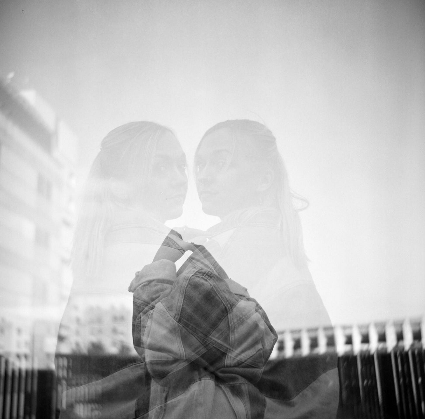 We didn’t have a plan so we took a walk and there was something about this urban space. I got Kate to have her back to me and turn and thought it would look great as a double exposure. I was so happy when it worked.