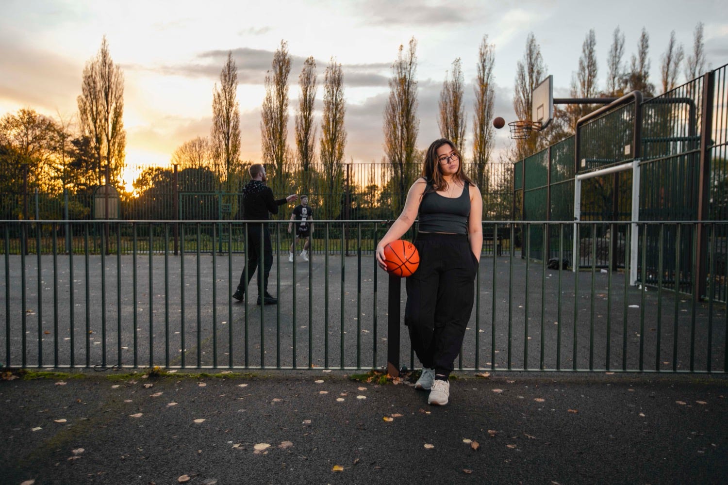 4) The musician, Celia Grace, released an EP called Sports and wanted some photos that reflected the title. I had the idea of an outdoor basketball court and when we arrived there were two guys on court. I asked if we could have Celia pose as they played in the background ... and the sun was setting just nicely and this is why I chose this photo over another I have of Celia Grace close up and low angle.