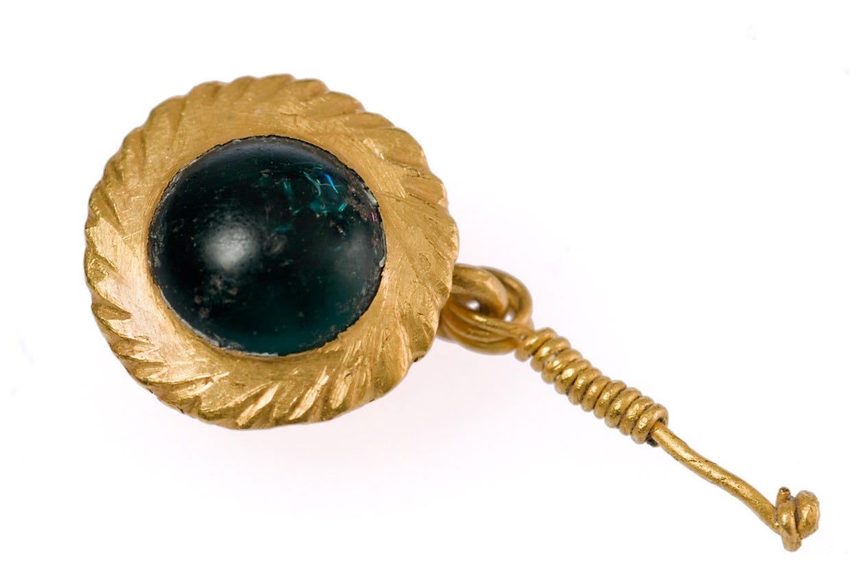The most elaborate earring found at Vindolanda is a gold circle surrounding a green glass bead made to look like an emerald.
