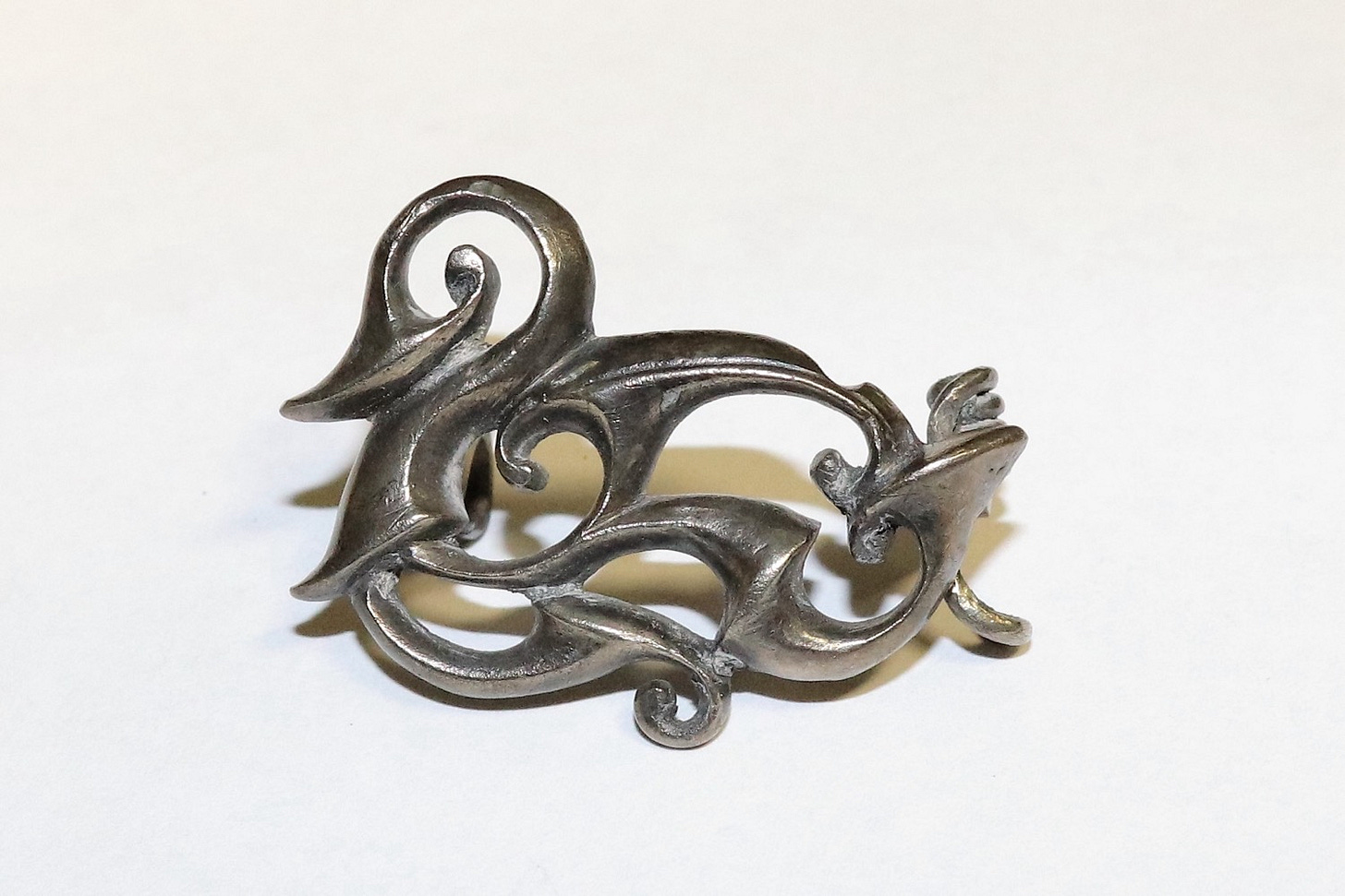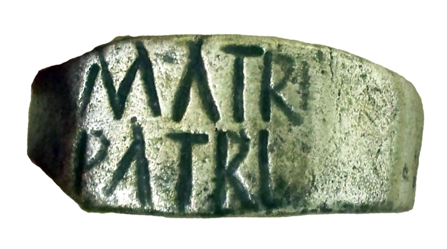 A silver brooch is in the form of a stylised duck. A silver ring is inscribed with the words Matri/Patri, which translates as mother/father, perhaps serving as a sentimental reminder of the owner’s original home.