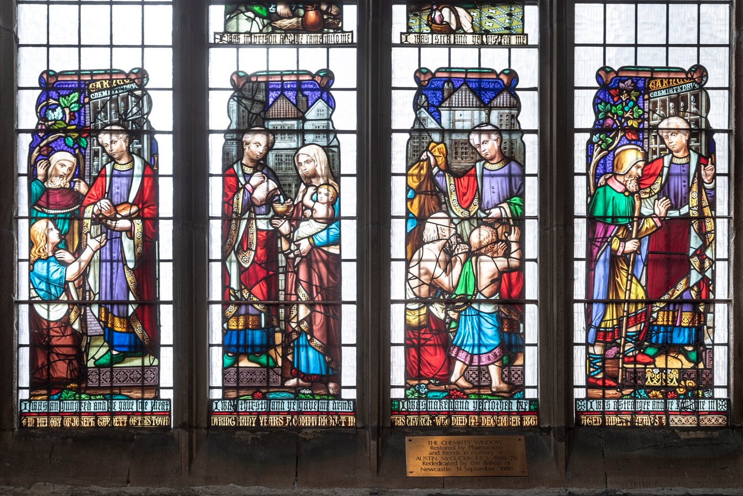 Dating from 1866, the window commemorates Joseph Garnet, a Newcastle chemist and member of the cathedral congregation when it was known as St Nicholas’ Church. Garnet ran a shop nearby and was known locally for his understated generosity. Only after his death in 1861 did the full extent of his charitable work become known, prompting friends to raise funds for a memorial window in his honour.