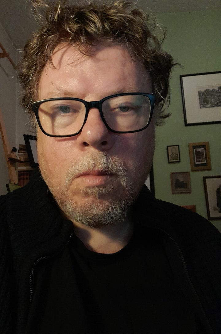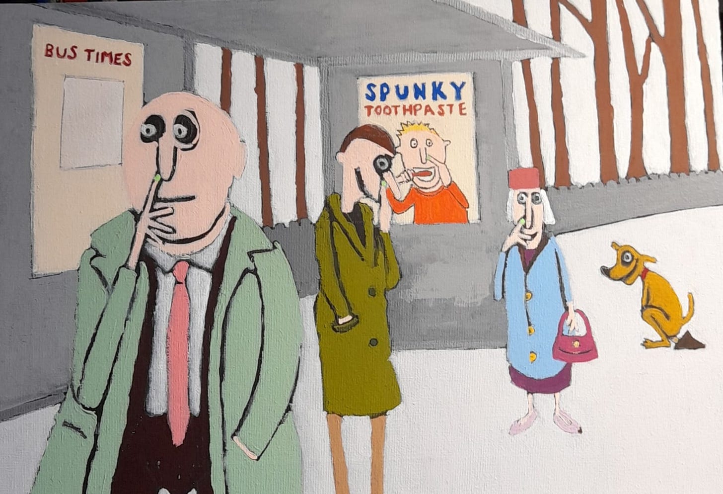 Colin’s painting is titled Waiting for the No. 69 bus to Hell via Normalcy.