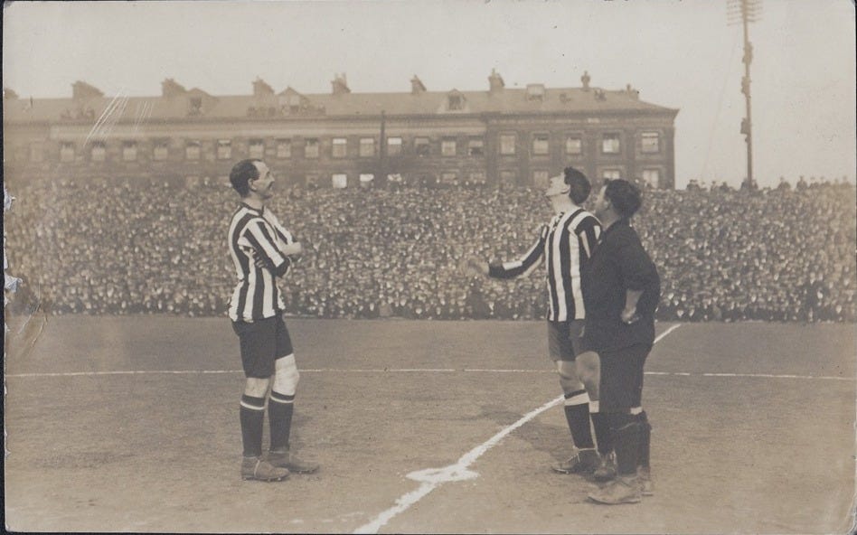 During a derby match at Roker Park, Newcastle’s long-serving full-back Bill McCracken was pelted by Sunderland supporters with apples and oranges and, it is reported, “other provisions for the table.”