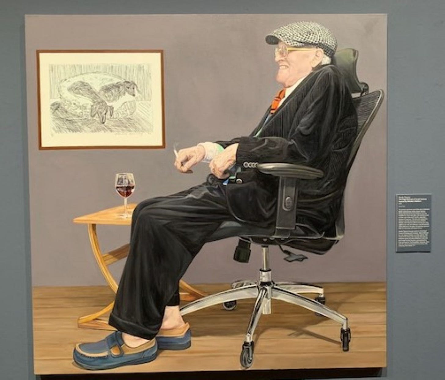 The humour of the painting extends to the title chosen by artist Brenda Zlamany – Two Dogs (Portrait of David Hockney Inspired by Whistler’s Mother). The two dogs can be seen in a wall-mounted picture in the picture.