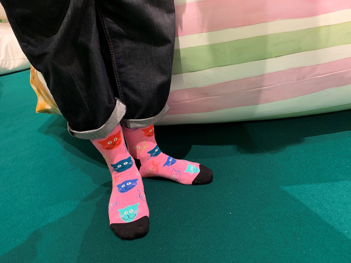 She had her shoes off already, but mainly, I suspect, because she was keen to show off her socks, suitably decorated with cats’ faces.