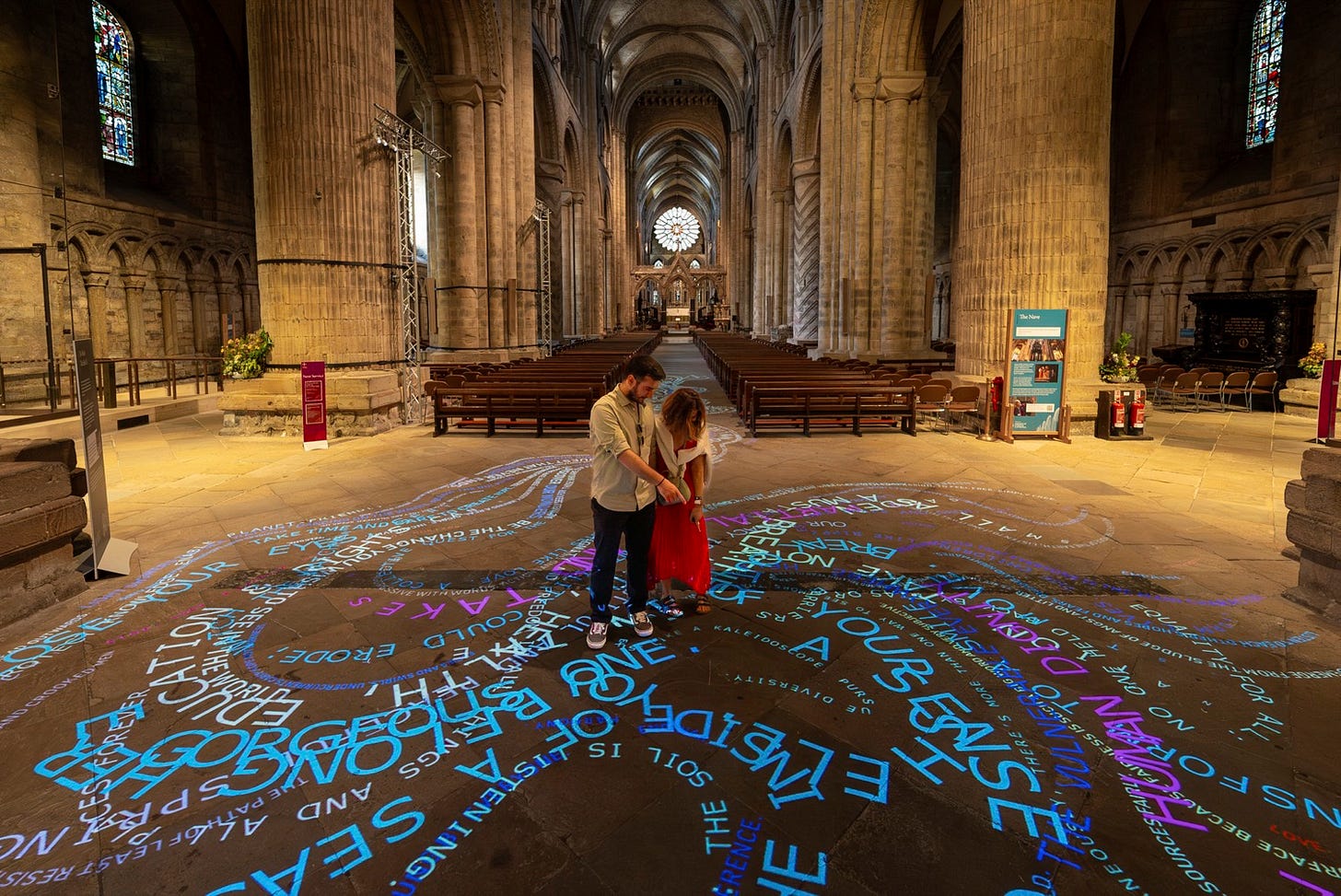 Commissioned specially for the exhibition was a light-based artwork, The Words That Bind Us, taking centre stage in the Cathedral’s Nave.