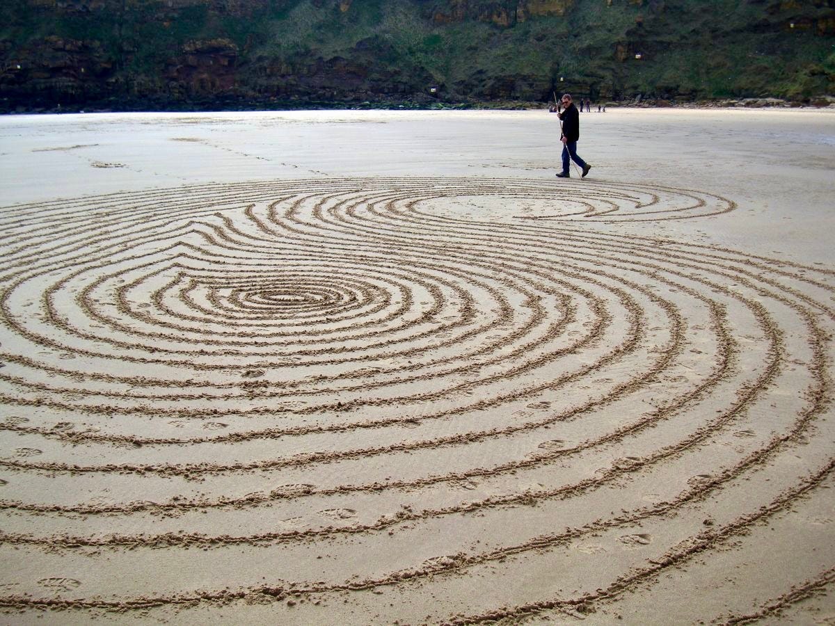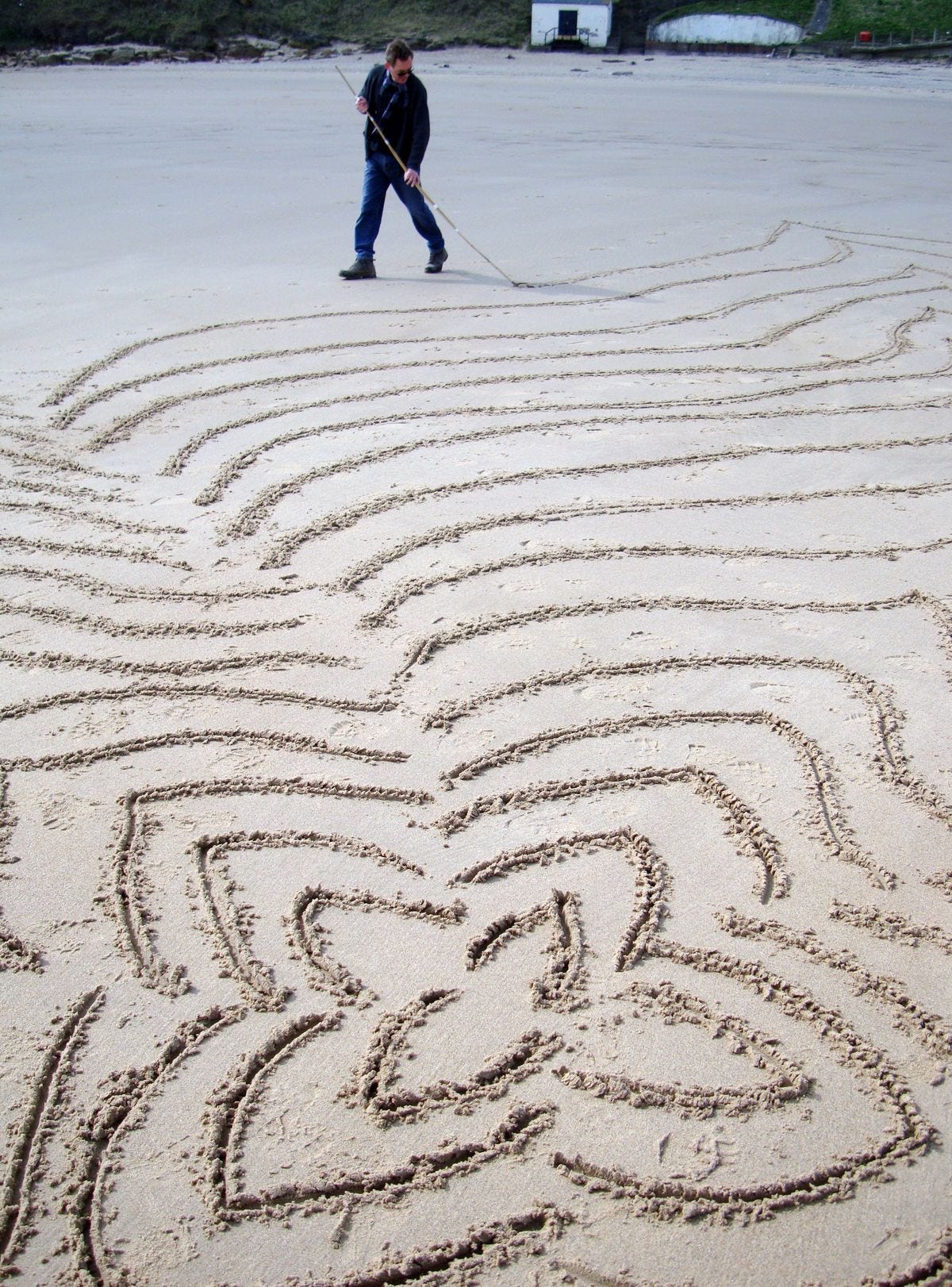 His large-scale sand drawings, made between 2000 and 2016, combined a fluency of drawing, walking and inhabiting a place, with ideas of the temporal; of finding and delineating a drawing only to have it washed away as the tide turned.