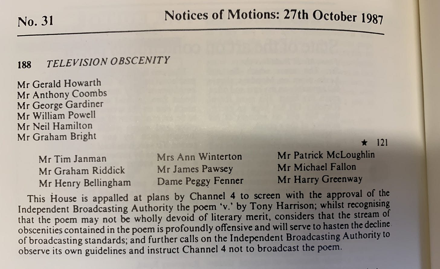 I well remember the fuss whipped up by Channel 4’s decision to broadcast a film version of his poem V. in 1987. The Daily Mail called it “a torrent of four-letter filth” while Mary Whitehouse, self-appointed guardian of public morality, rowed in with “this work of singular nastiness”.