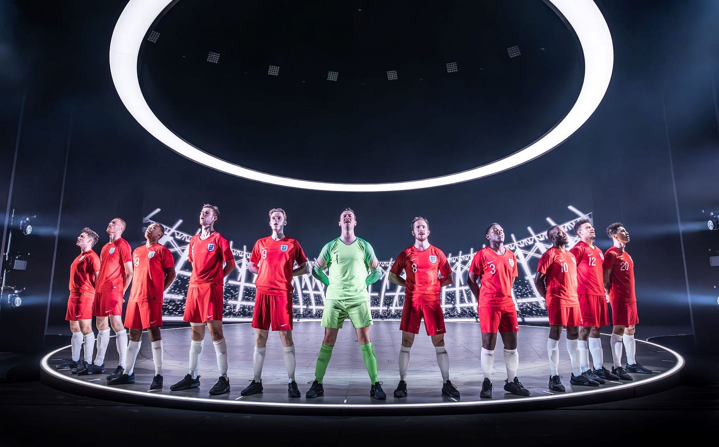 Technically, as you’d hope from a National Theatre main house touring production, Dear England is masterful. A great hoop of light hangs over the stage and as a projection of Wembley Stadium rises to meet it and the anthemic music cranks up, you’d swear you were there, caught up in the moment.