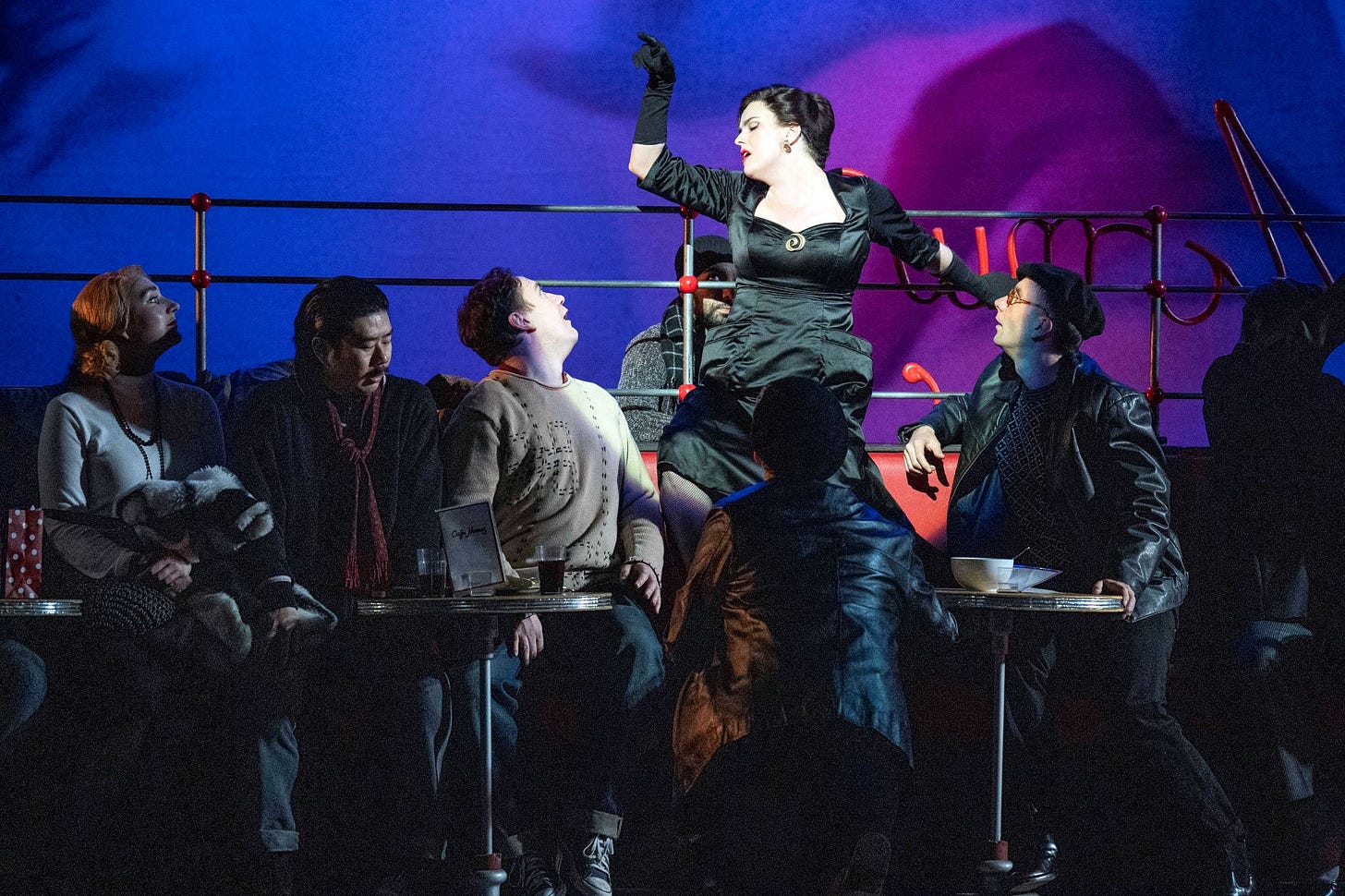 Katie Bird delivers a high octane Musetta, one minute on the seats, the next writhing on the floor beneath Marcello (Korean baritone Josef Jeongmeen Ahn enjoying himself, no doubt) but winning applause for her famous Musetta’s Waltz aria, one of La bohème’s showstopping moments.