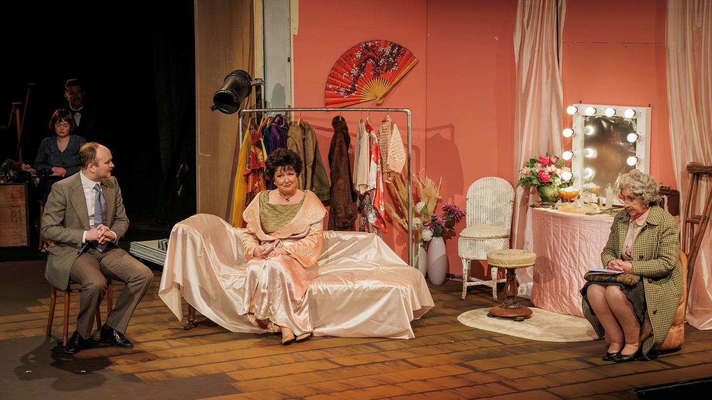 Much more Hollywood-sounding is Moira Valentine who plays the fading screen star with panache, and makes good use of a chaise longue, that furniture item designed with the poseur in mind.
