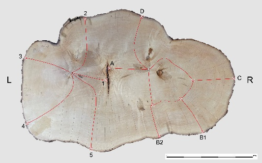 By counting the sequence of tree rings taken from a cross-section of the felled part of the tree, the researchers were able to arrive at an estimated overall count of 100–120 growth rings for the two main stems.
