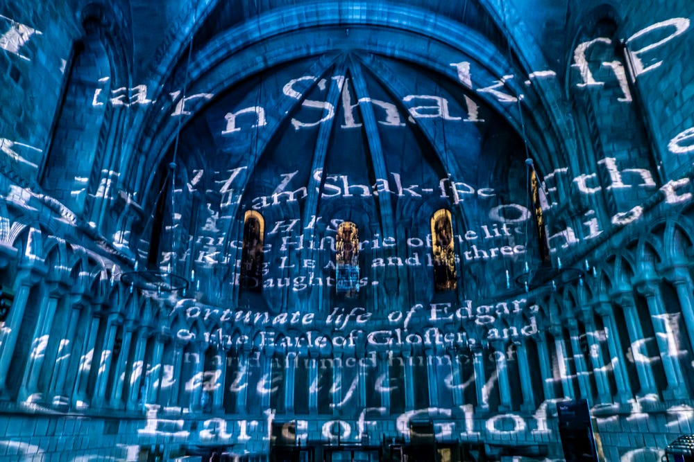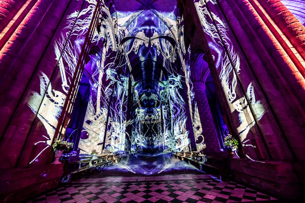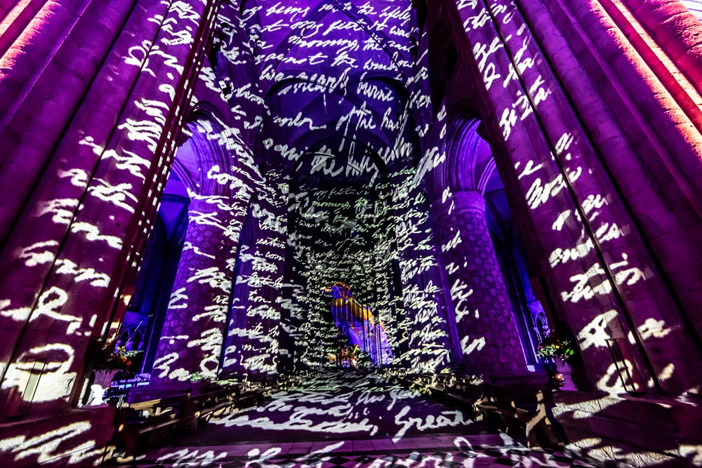 Now in its fourth year, the show floods the cathedral’s towering architecture with projections of manuscripts, text and characters that slip and shimmer across the stone.