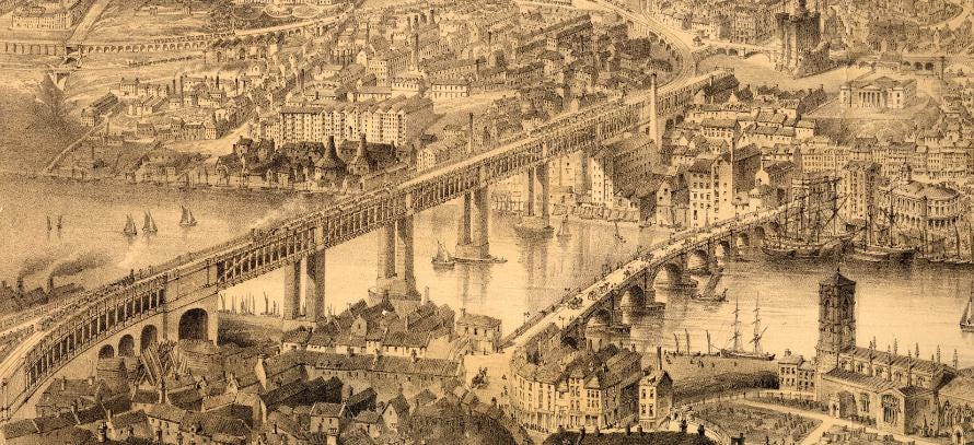 One shows Robert Stephenson’s new High Level Bridge with its upper railway deck towering over the adjacent late 18th century bridge which catered for pedestrians and horse traffic and would be replaced by the Swing Bridge.