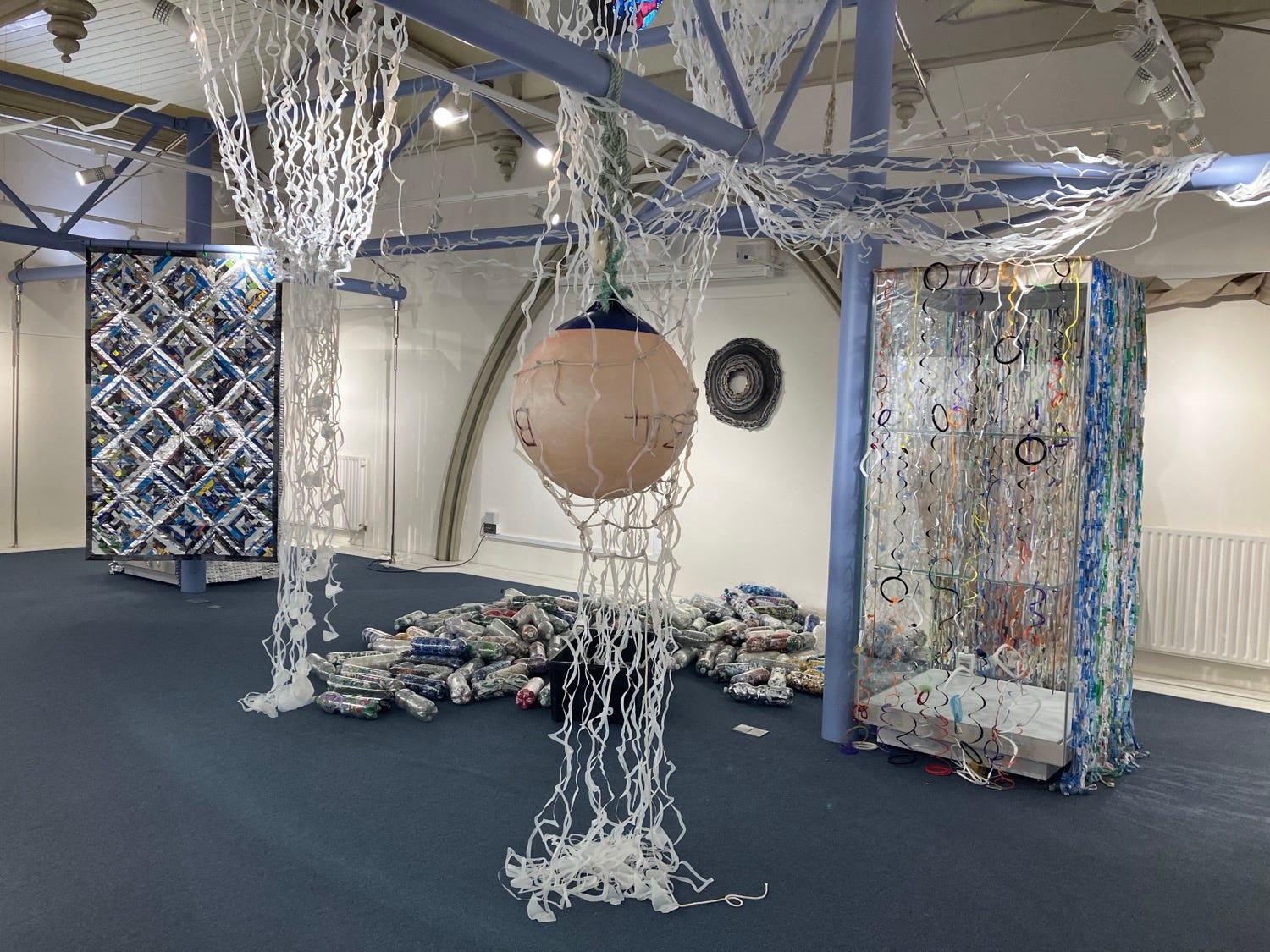 More than 90 plastic milk bottles, each cut into a continuous strip, feature in her exhibit Catch of the Day along with a lobster pot float. The longest strip from a large milk bottle was over eight metres in length and the shortest from the smallest bottles were more than four metres.