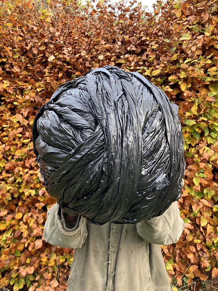 One of her most exotically named pieces arose from her coming across a fence line and trees festooned in weathered strips of black silage bale plastic.