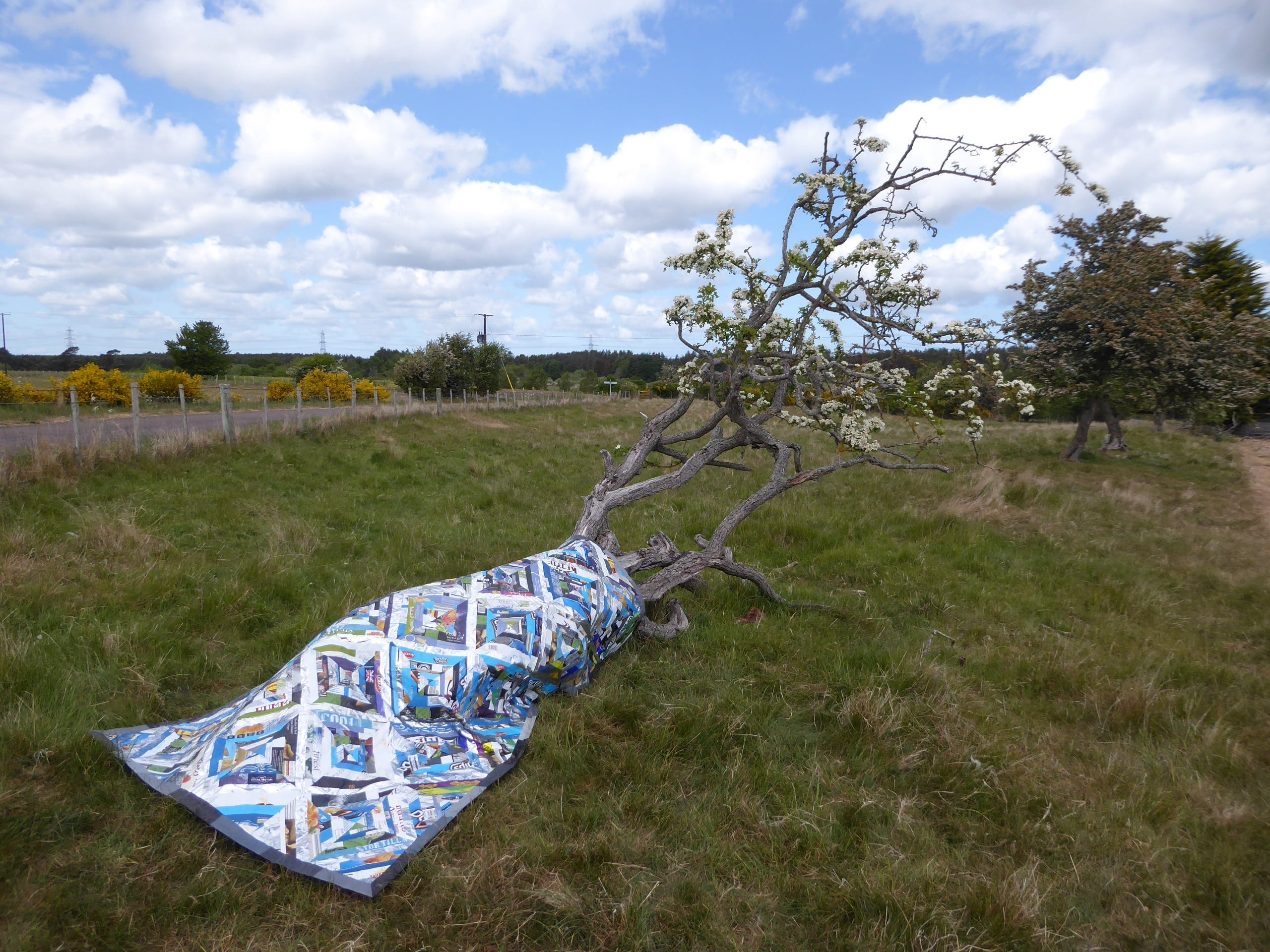 That led to her creation called Comforter, in which she used quilting techniques to fashion a covering for the tree made from crisp packets, aluminium foil and bubble wrap.