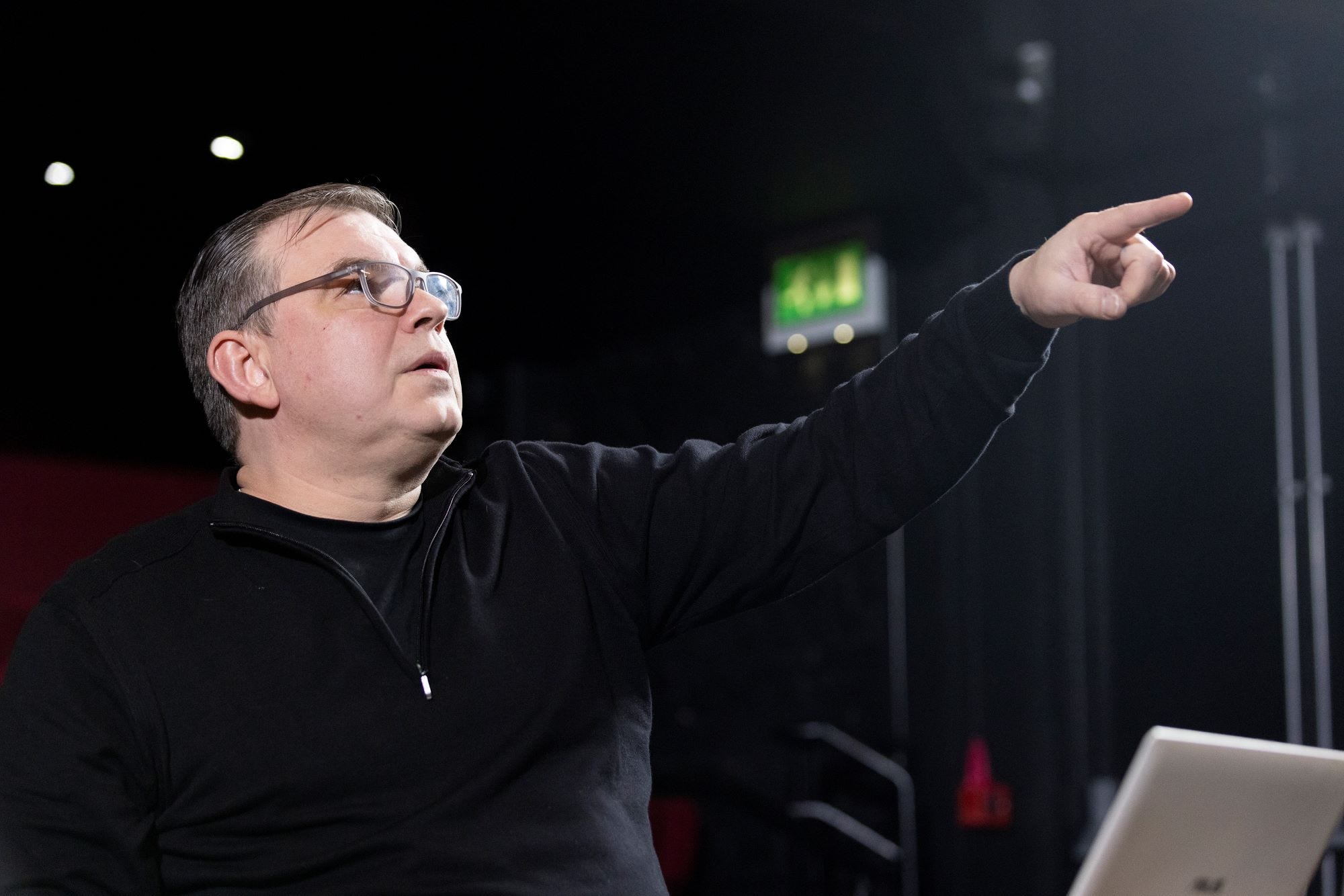 In an empty theatre, with the stage and walls painted as dark as the subject matter, I am watching a short scene being rehearsed… over and over again, so it’s absolutely right.