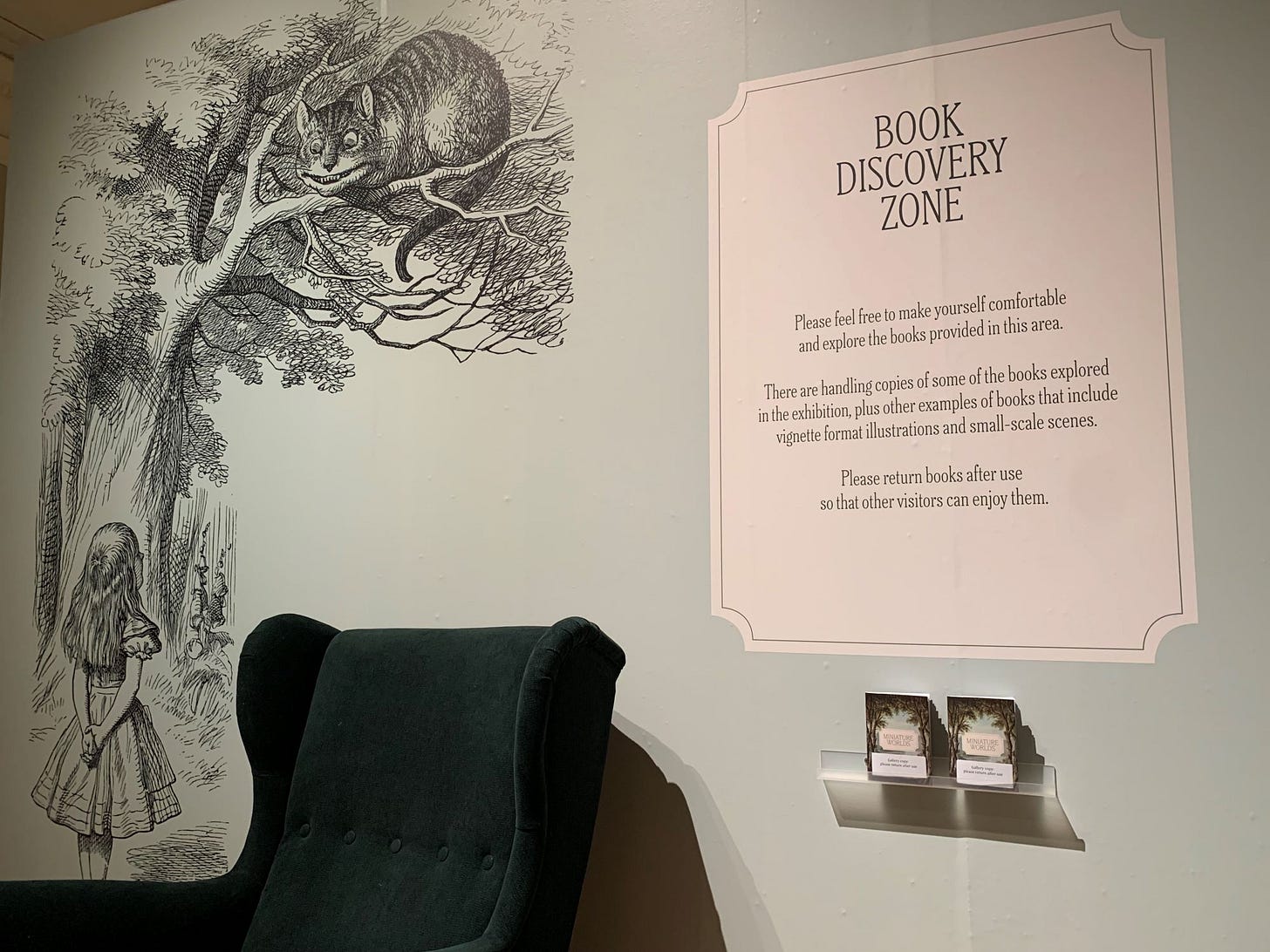 This bit of the exhibition, called Imagined Worlds, has a book discovery zone with some welcome comfy chairs and an overblown depiction of the Cheshire Cat, as scarily imagined by Sir John Tenniel for Alice’s Adventures in Wonderland.